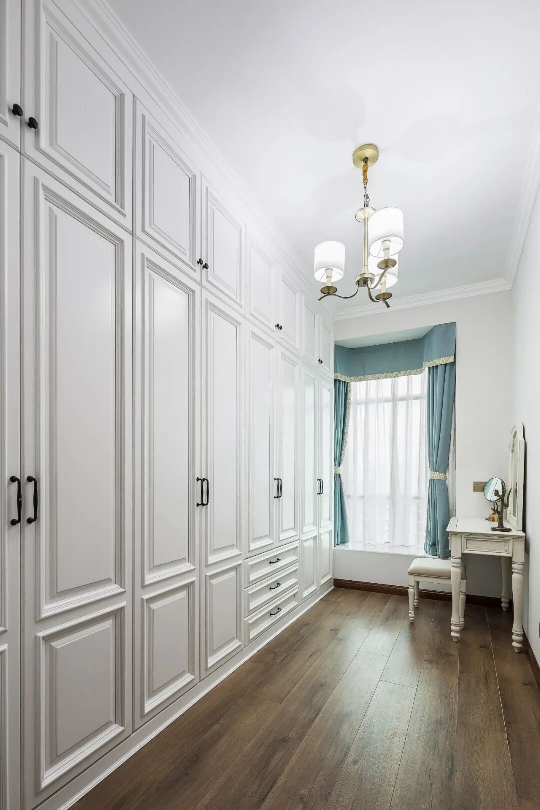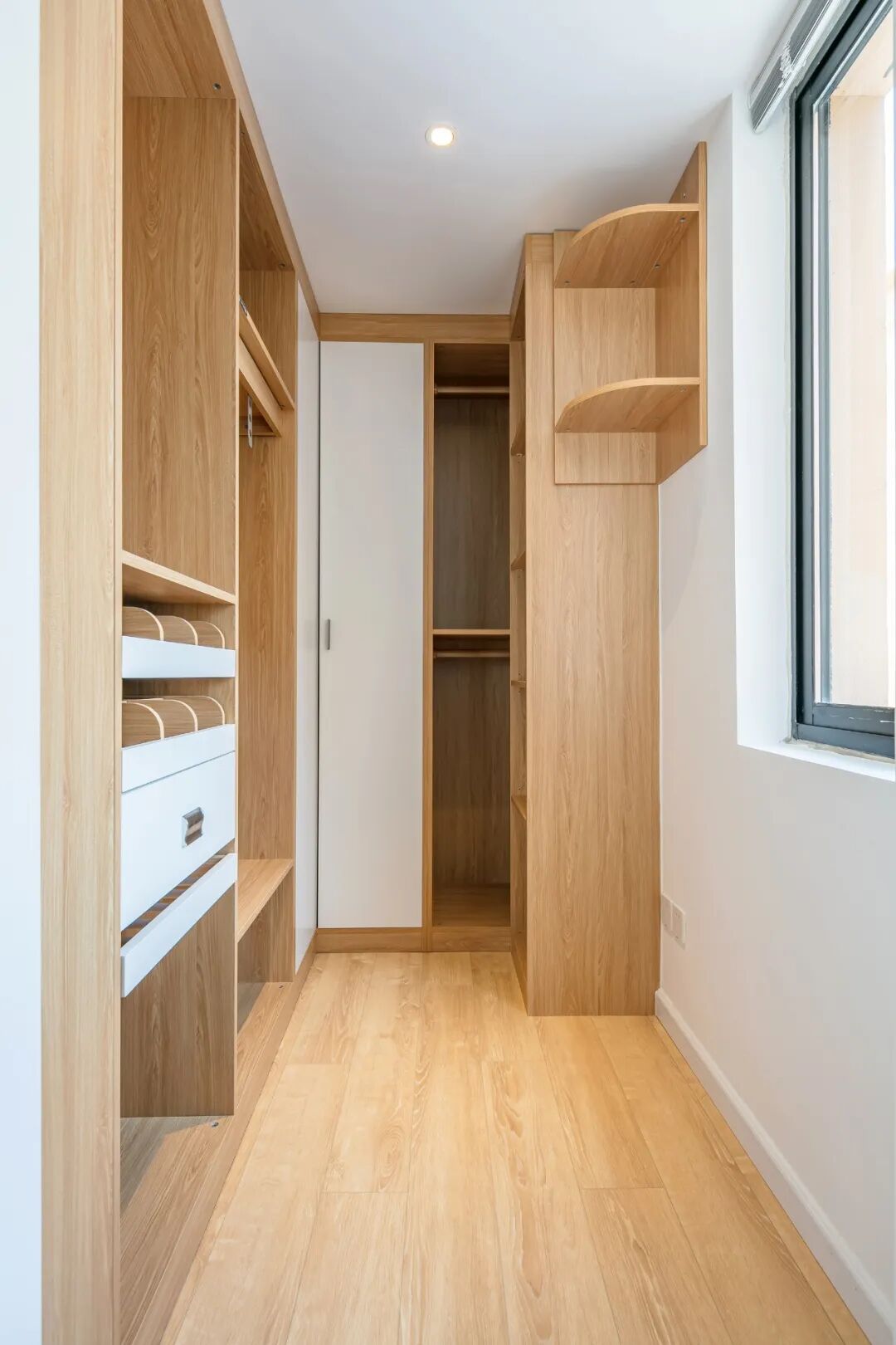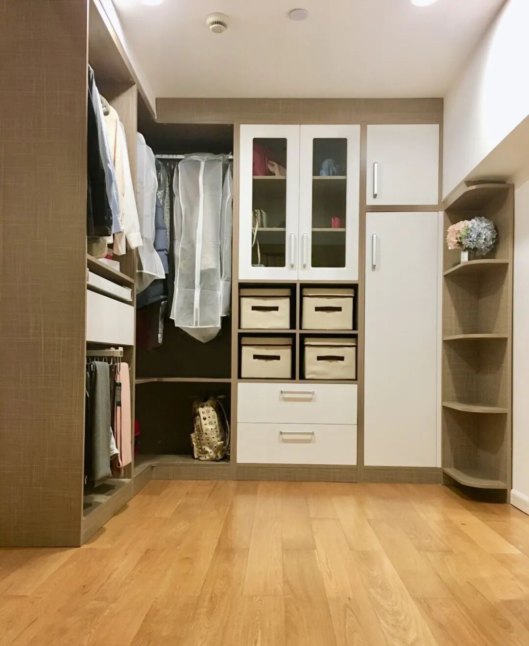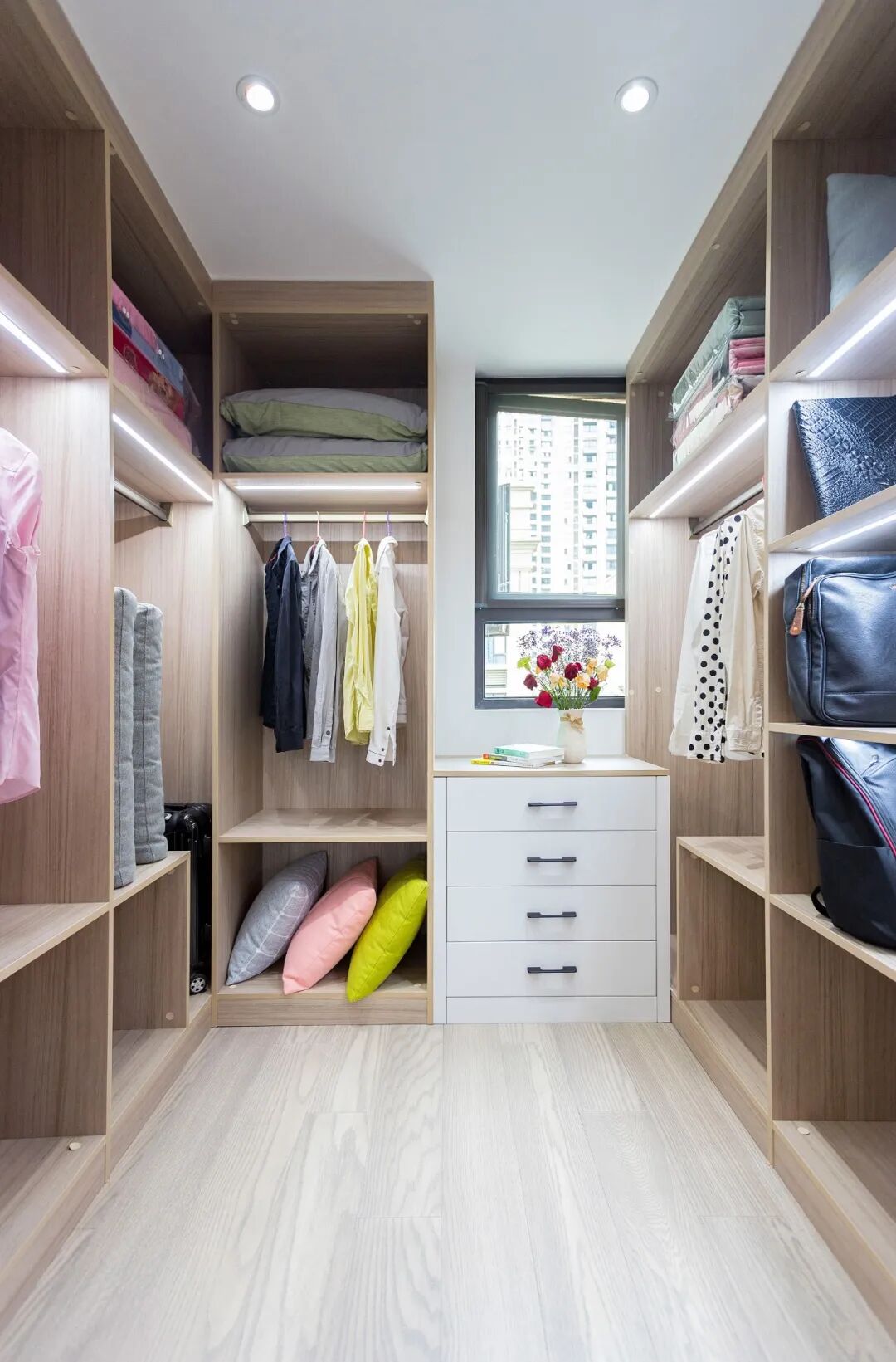 衣帽间作为家里一个较为私密的空间,如果这边本身就是封闭的空间,那么衣帽间里的柜子就可以装成开放式的,这样主人进去找衣物的时候,就可以做到一目了然,不需要每个柜子都去分别开门。