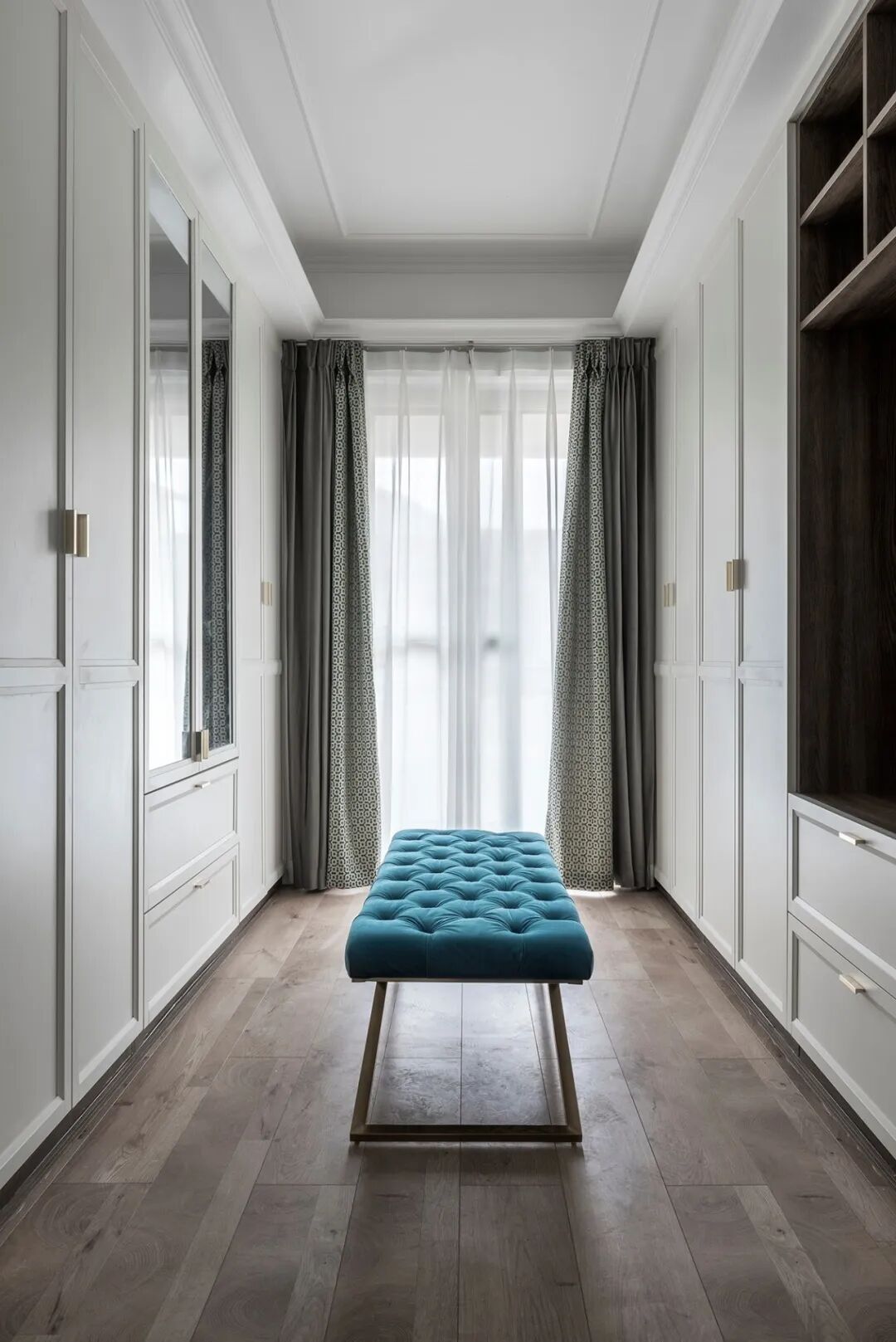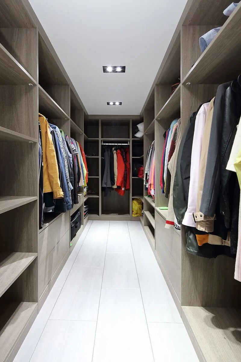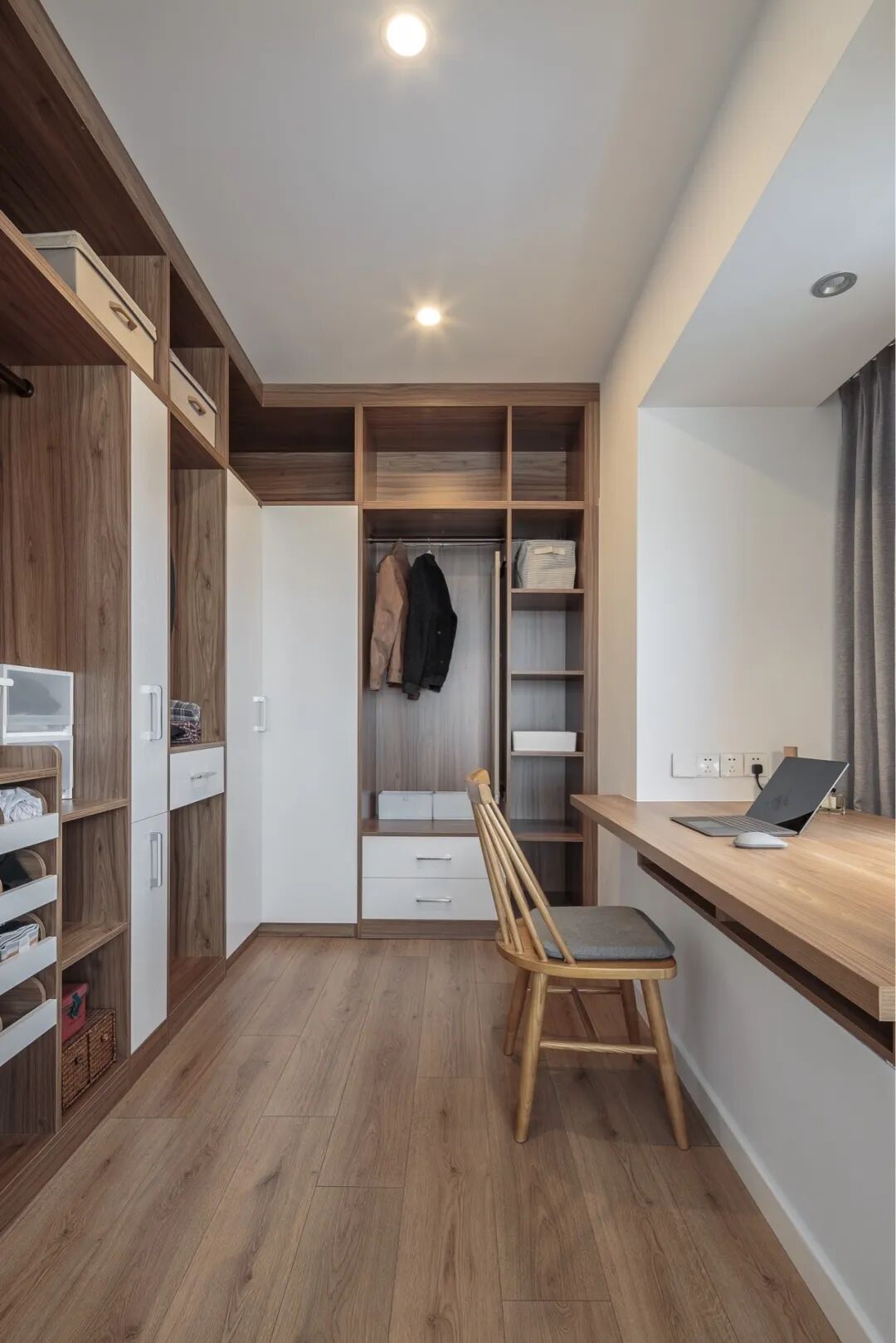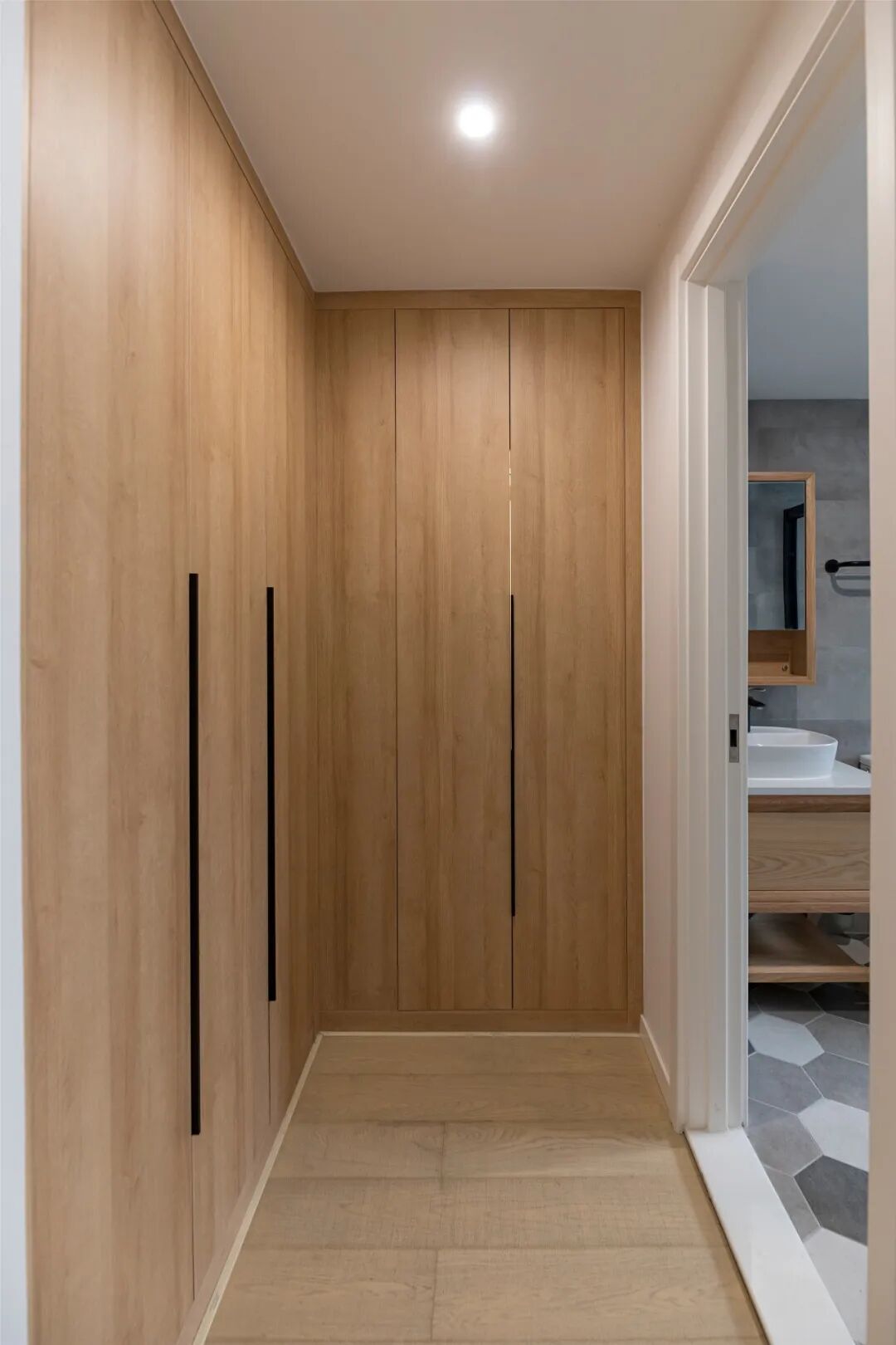 衣帽间作为家里一个较为私密的空间,如果这边本身就是封闭的空间,那么衣帽间里的柜子就可以装成开放式的,这样主人进去找衣物的时候,就可以做到一目了然,不需要每个柜子都去分别开门。