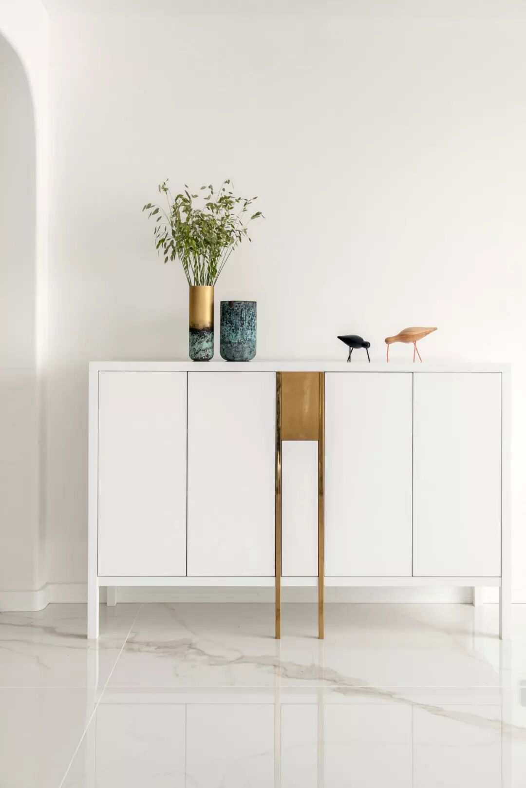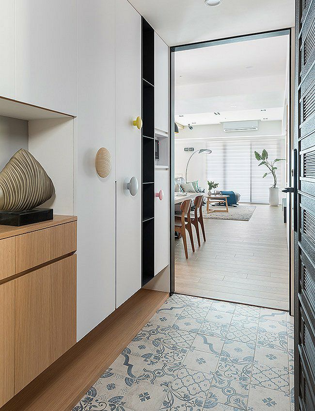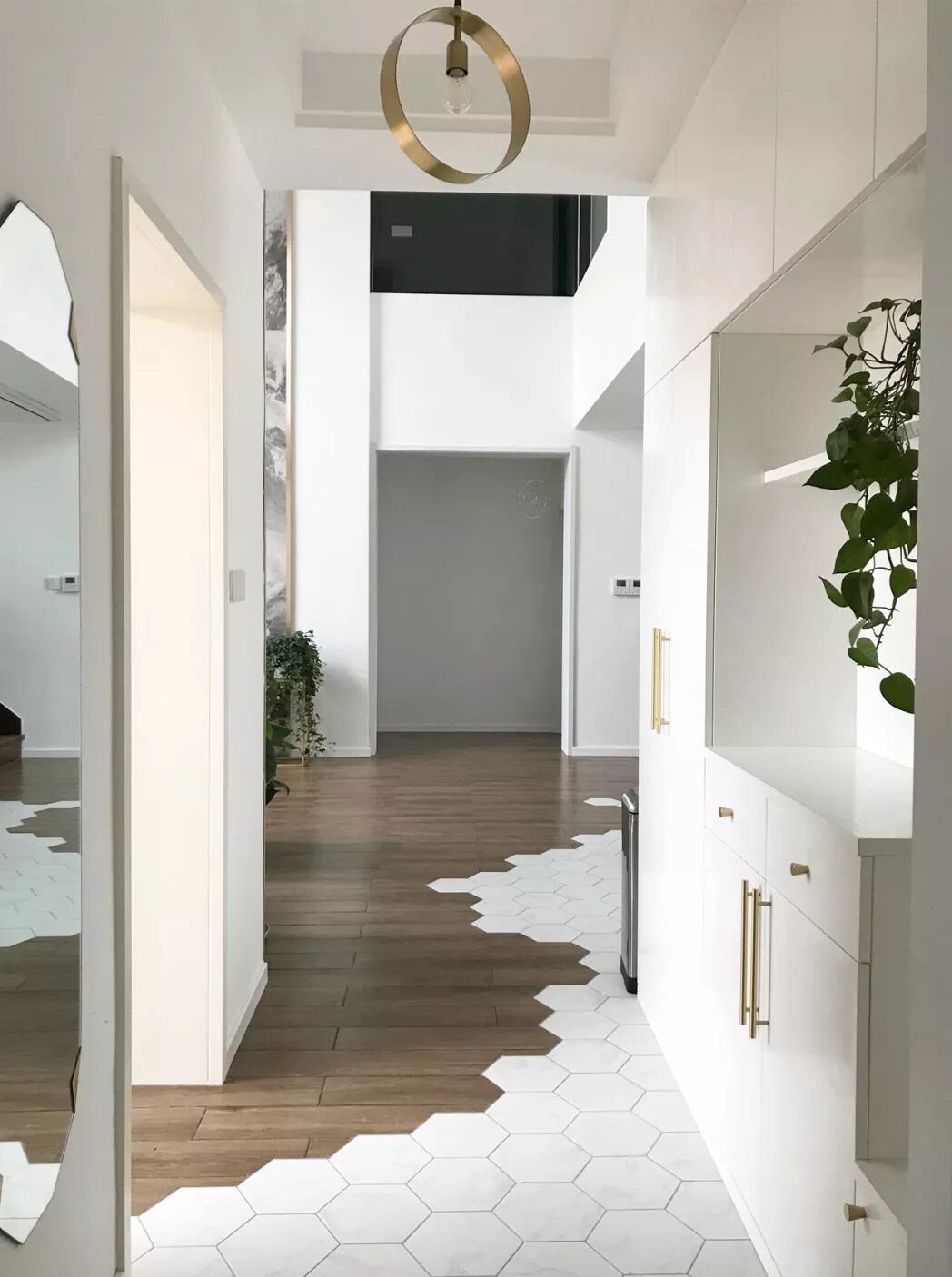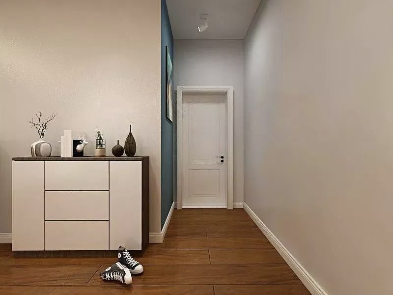 解决方式:赤裸裸的过道,基本没啥搞头了,只能把鞋柜安置在走道拐角,平行于大门的墙面一侧,开门走两步也能随时换鞋,动线也合理。