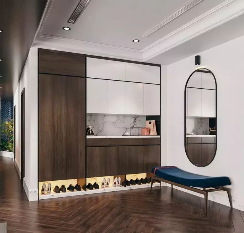 为了体验更好,我们可以在鞋柜底部安装感应灯,换鞋的时候能看清。