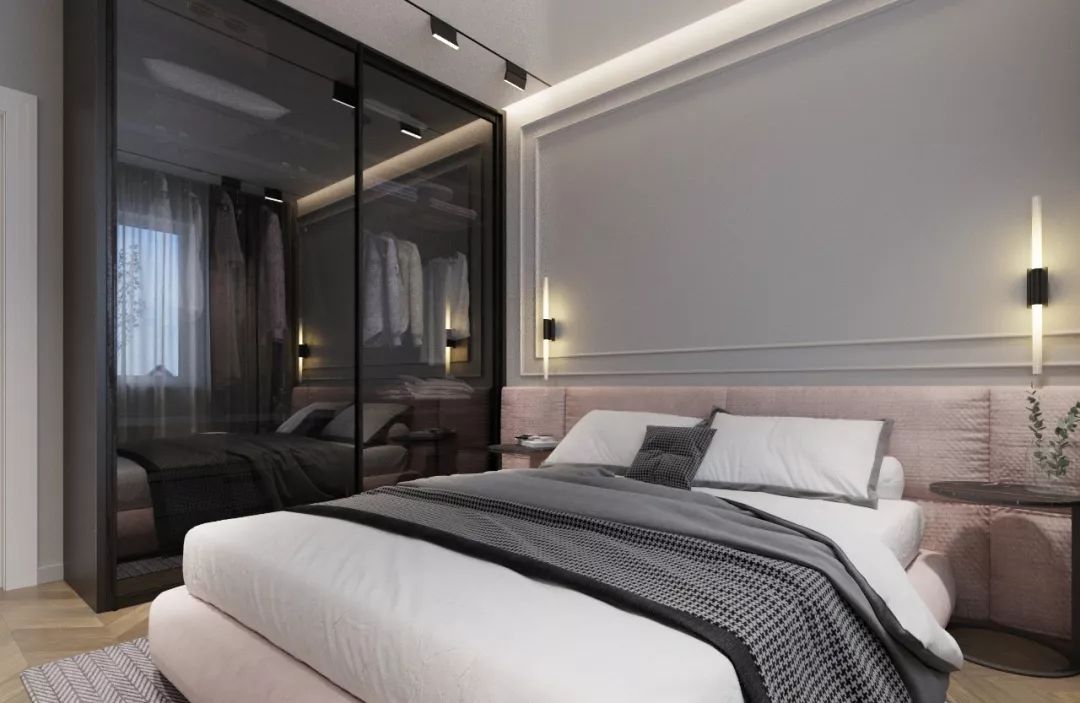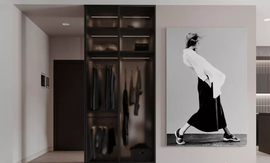 还可以使用磨砂玻璃的柜门,不仅能让衣柜空间不完全裸露,还能给人一种朦胧的美感,烤漆玻璃泛着淡淡的奶白色,让人觉得很柔美,同时它能够极好的隐藏起衣柜内部,保留了主人更多的隐私。