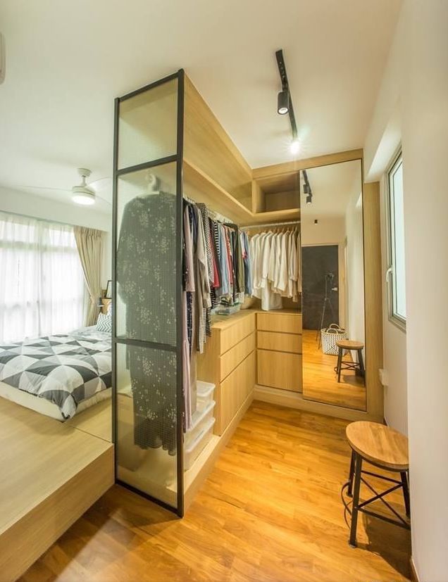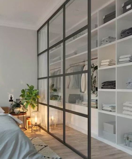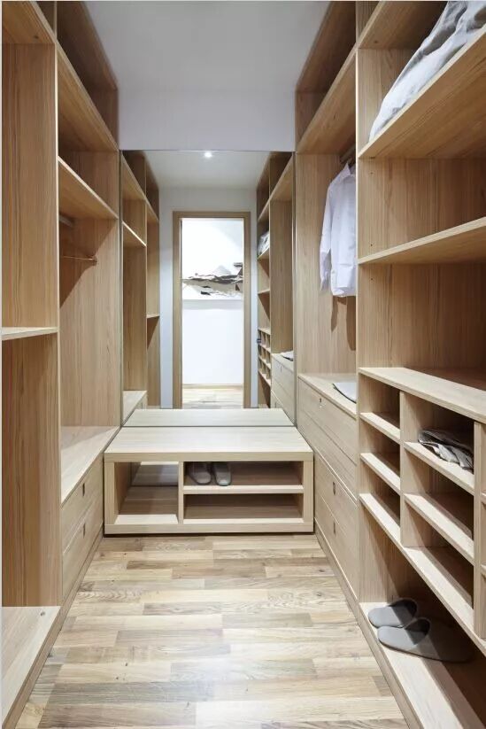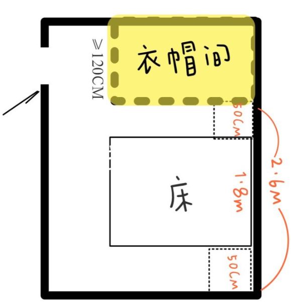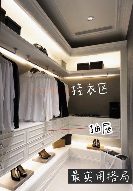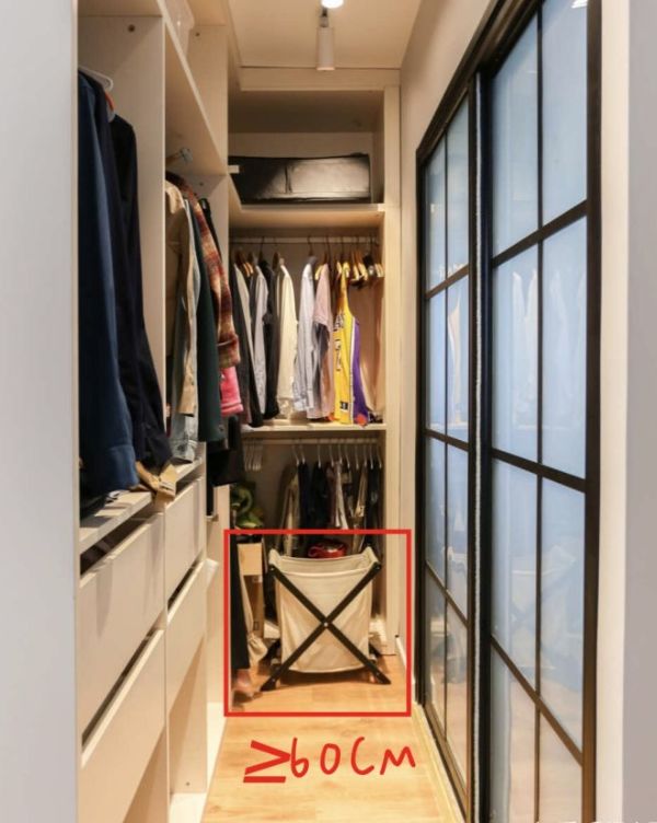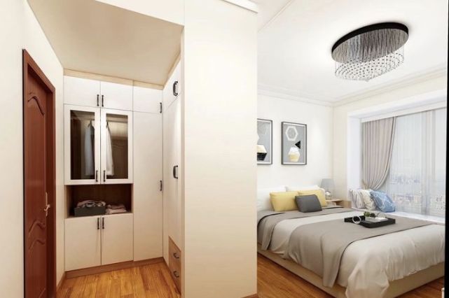 按柜深60cm算,过道60cm,加起来宽度不小于120cm,然后加上2.5米的长,最后也就需要3㎡左右的空间。上面说的120cm宽的衣帽间,是属于比较迷你型的。这样的衣帽间,一般以满足基础功能为主。如下图,只要卧室床头旁边有120cm以上的空间,都能设计一个衣帽间。如果这个空间是墙体,那就看看是否是承重墙,如果不是,那就敲掉一面墙,装上玻璃门,一个迷你衣帽间就这样诞生了。只要空间规划得当,衣帽间里还可以塞下一个小小的梳妆台。如果卧室户型很方正,进门后的旁边没有墙体阻隔,那还可以用玻璃隔断隔出一个衣帽间。或者是先设计一面大衣柜,然后再加多一扇玻璃推拉门,这样也能得到一个很不错的衣帽间。只不过这样的衣帽间,在功能上跟普通的大衣柜差别不大。如果你家卧室比较大,卧室宽度大于4米,那就选用下图的这种衣帽间。直接用两面衣柜围出一个衣帽间。这样的衣帽间储物空间是翻了一倍的,可以收更多更多的好看衣服。如果空间足够,还可以设计一个多功能柜体,增加一个梳妆台,简直稳稳的幸福。还有一种更大胆,更创意的设计,把整个床和衣柜连成一个大型的榻榻米来设计。对,就是一个大型的榻榻米现场,如下图:对于个别带主卫的户型,像下图这种,如果从卫生间出来的过道足够宽,那就可以砌多一面墙,这样在卫生间门口就可以有一个衣帽间了。设计完成后,就是下图的模样啦。不过有个不好的地方就是,刚好挨着卫生间,进进出出的,多少有些不方便,这个区域也可能会比较潮湿。说完外部衣帽间的布局,下面来说下衣帽间的内部格局。衣帽间内部最实用的格局就是“上挂下抽”,即上面挂衣区,下面抽屉区。最顶部的空间的话就放一些换季的被子之类。如果是小户型,衣帽间面积不大,那可以不用单独留出一个梳妆台,换成下图这种伸缩的抽屉型梳妆台。衣帽间的内部布局一定要做收纳分区。像下图的案例,业主鞋子很多,所以下面一排有专门的鞋子收纳抽屉,上方主要用来挂衣服,然后大行李箱收纳在转角处。下图也是收纳做得比较好的案例,也是上挂下抽的布局。好啦,小户型装衣帽间的技巧就讲到这里啦,想要装的小伙伴赶紧行动起来把。