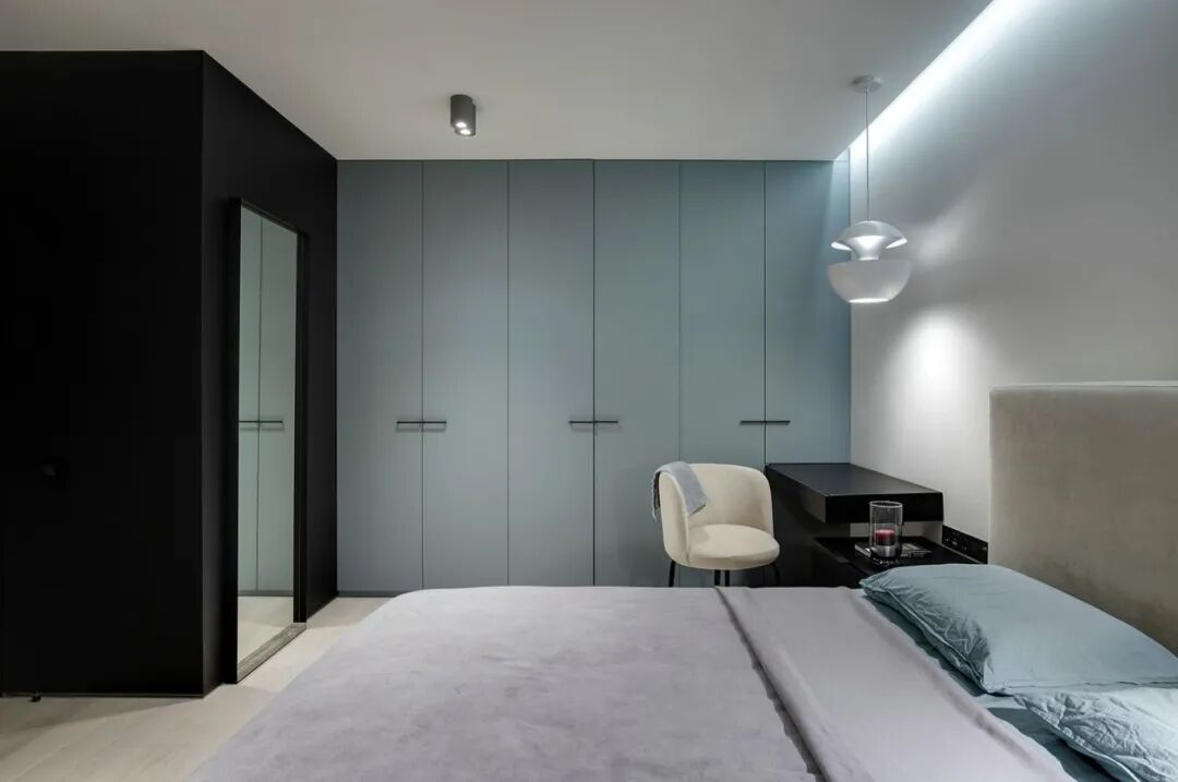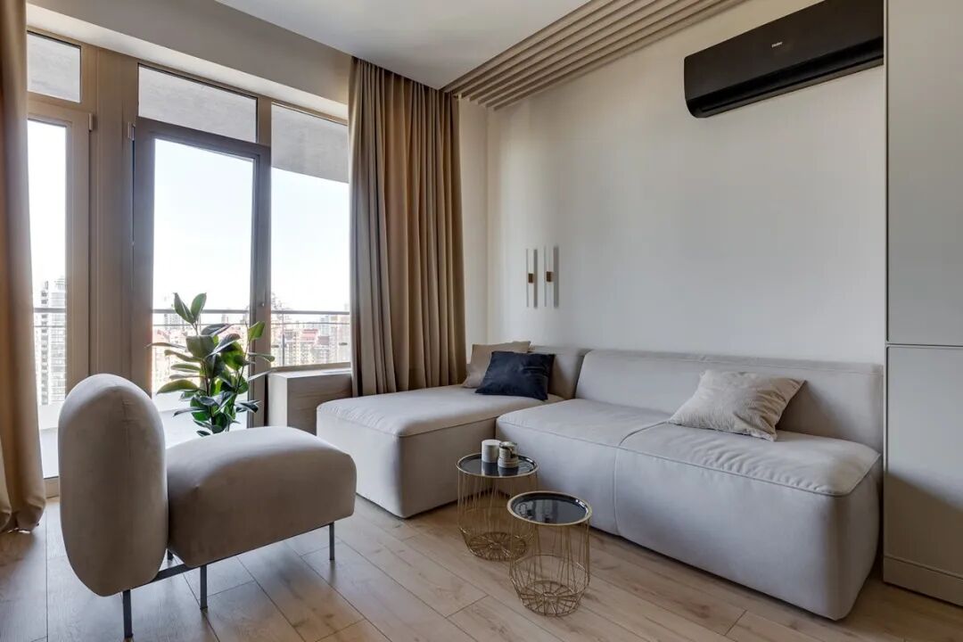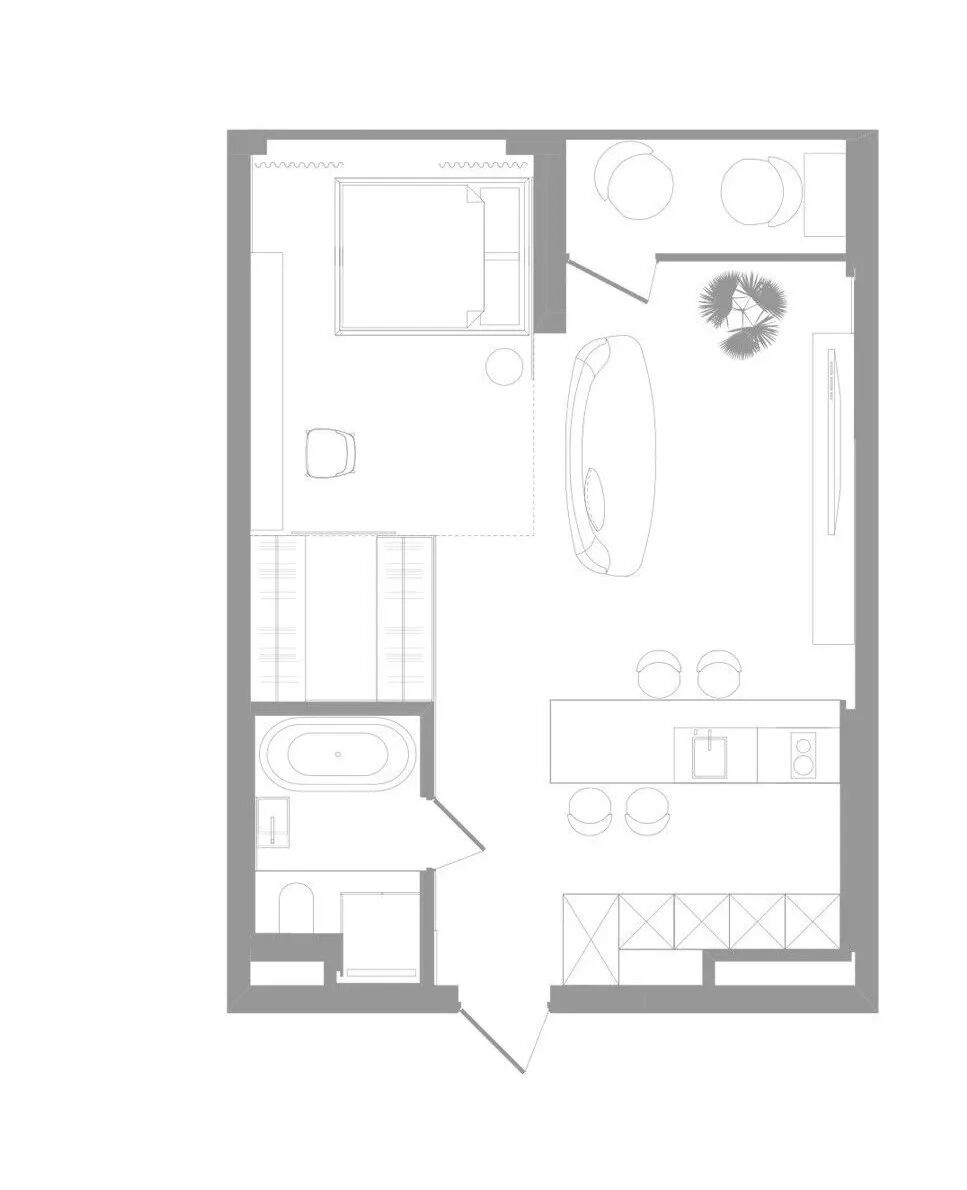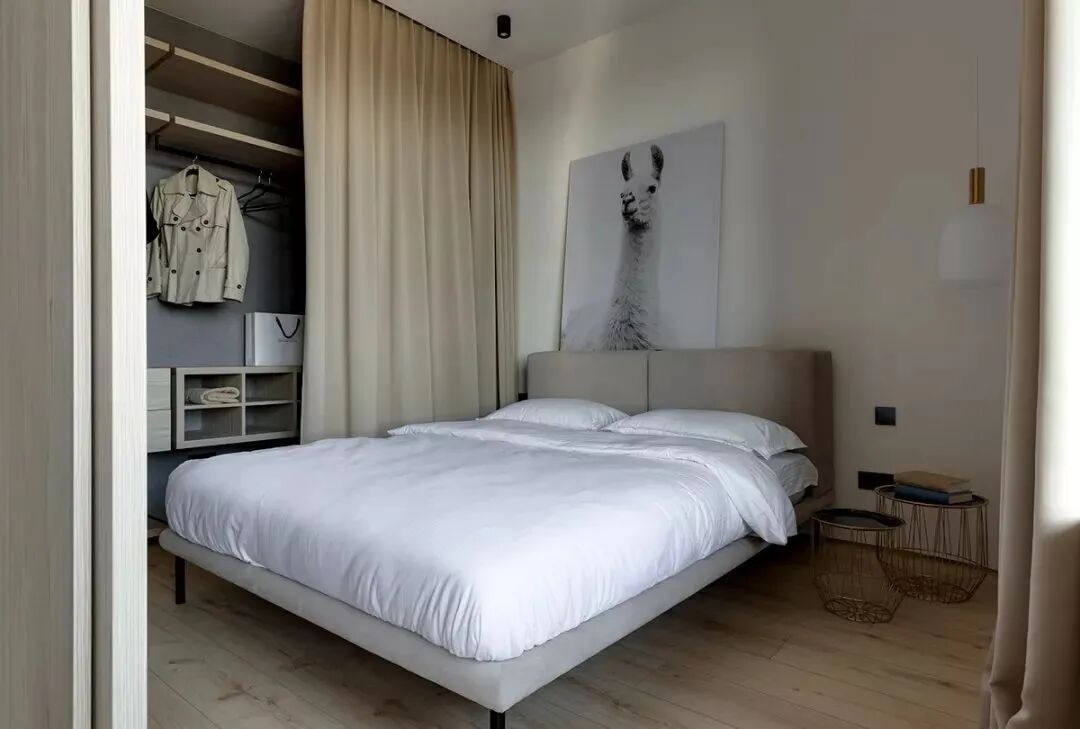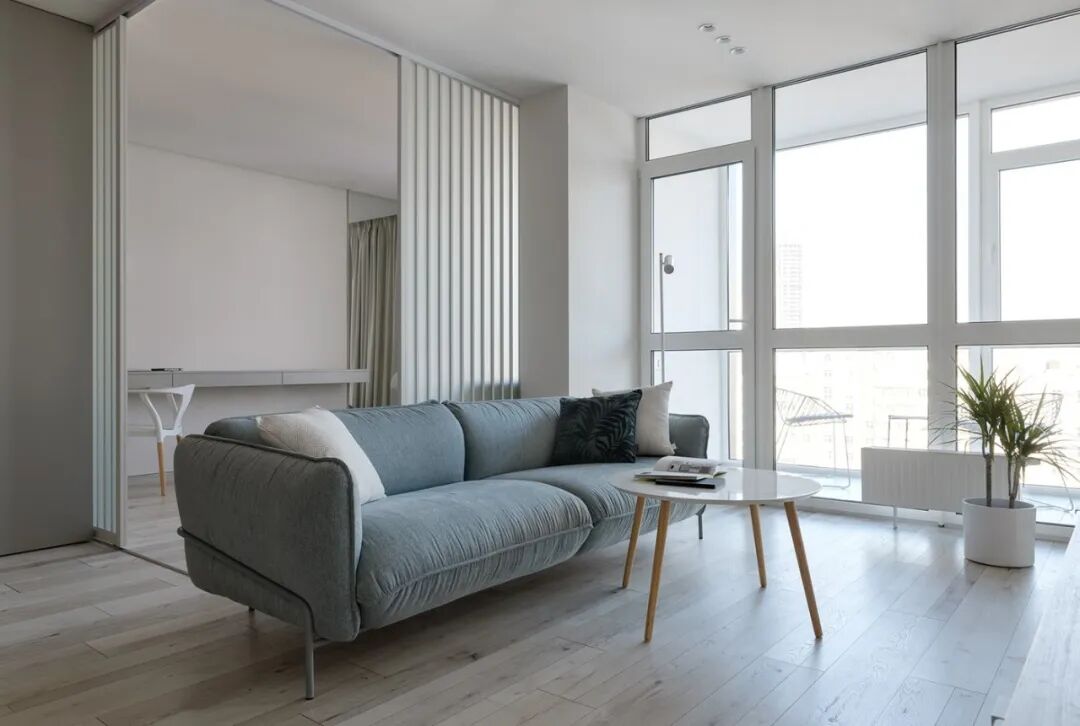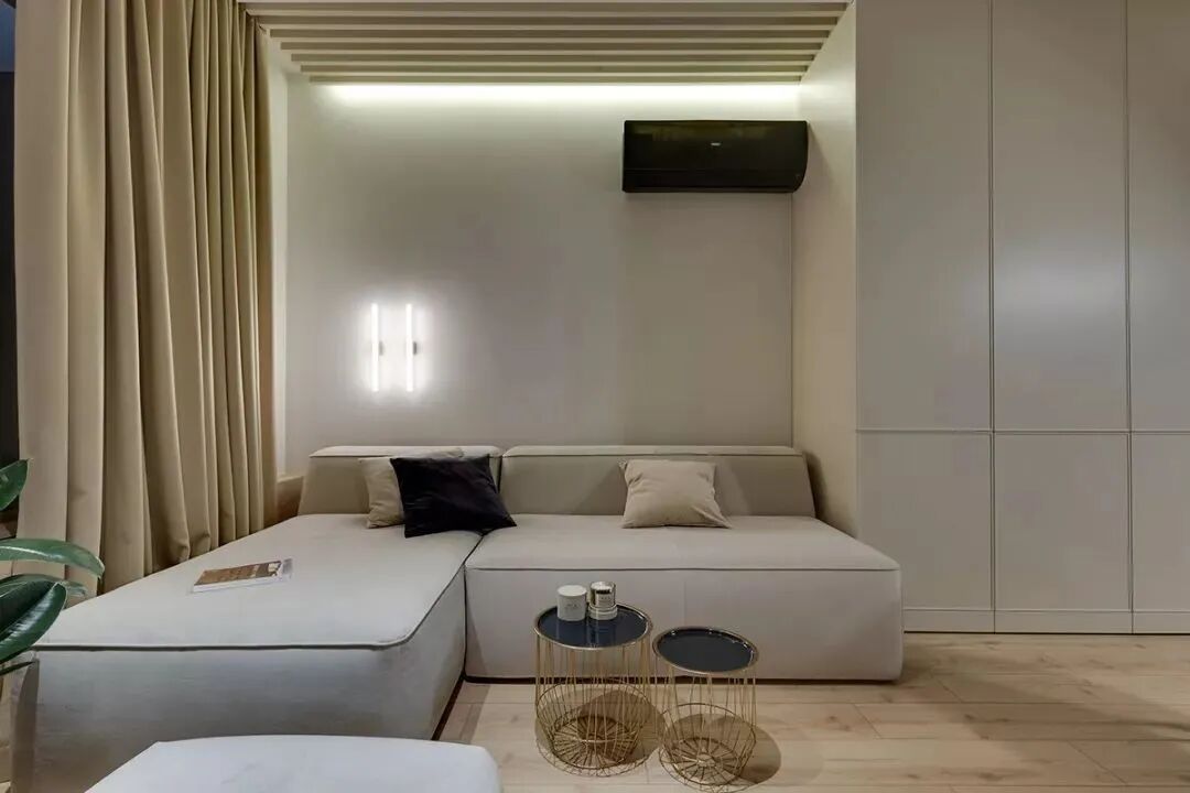 这套一室小住宅由设计师Yana Osipenko和Anastasiya Kurbakova共同设计,米色家居柔软自然,看起来非常舒适,光滑的表面,中性色调,轻木,柔软的纺织品和光。开放式的厨房,与起居空间一体,湿润的木饰面搭配深色的大理石,自然色调的柔和感加上些许装饰,就营造出了温馨氛围,小户型大理石+木饰面,一样可以秒杀大豪宅!大大的落地窗使得客厅光线充足,没有设主灯,顶部的灯带加上款式简约的壁灯,浅灰色沙发搭配木色地板,这是改善整个空间色温的好方法,使室内更加舒适和温暖。滑动木门后是卧室,简单的色彩,没有过多的修饰的线条,有一种恒久的灵思不轻易流走,有一种内敛的华彩不轻易张扬,给人视觉上的享受,每个角度都修饰的很完美,用平静的心灵看世界,利用淡淡的家具布局把原有的空间净化。卫生间以木色和蓝色的搭配,让空间色调不单一,有一种跳脱的美感,顿时喜欢的不得了,不同色彩,丰富空间的视觉效果。