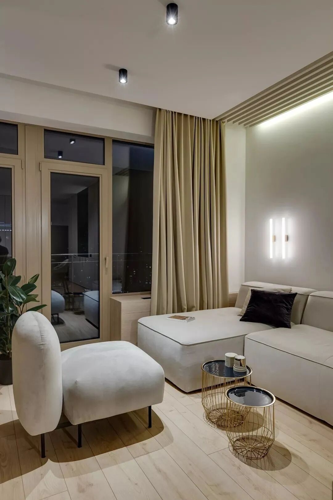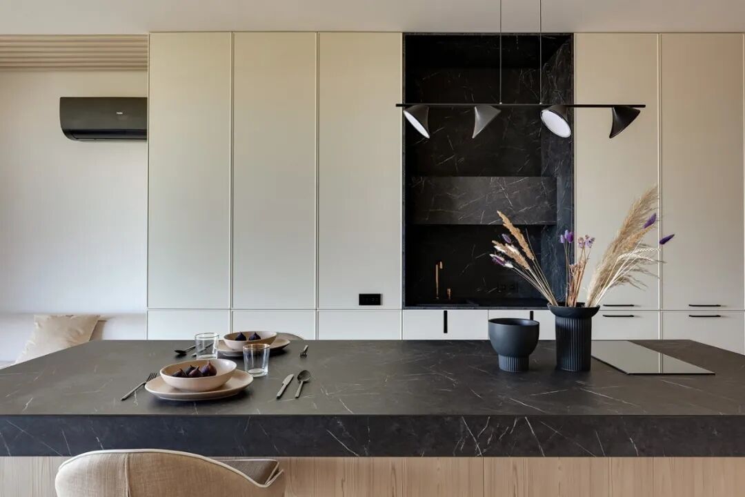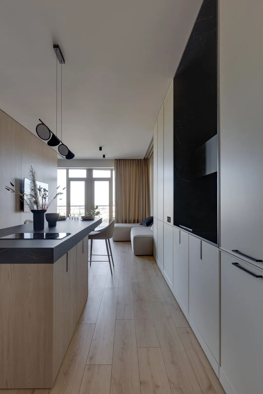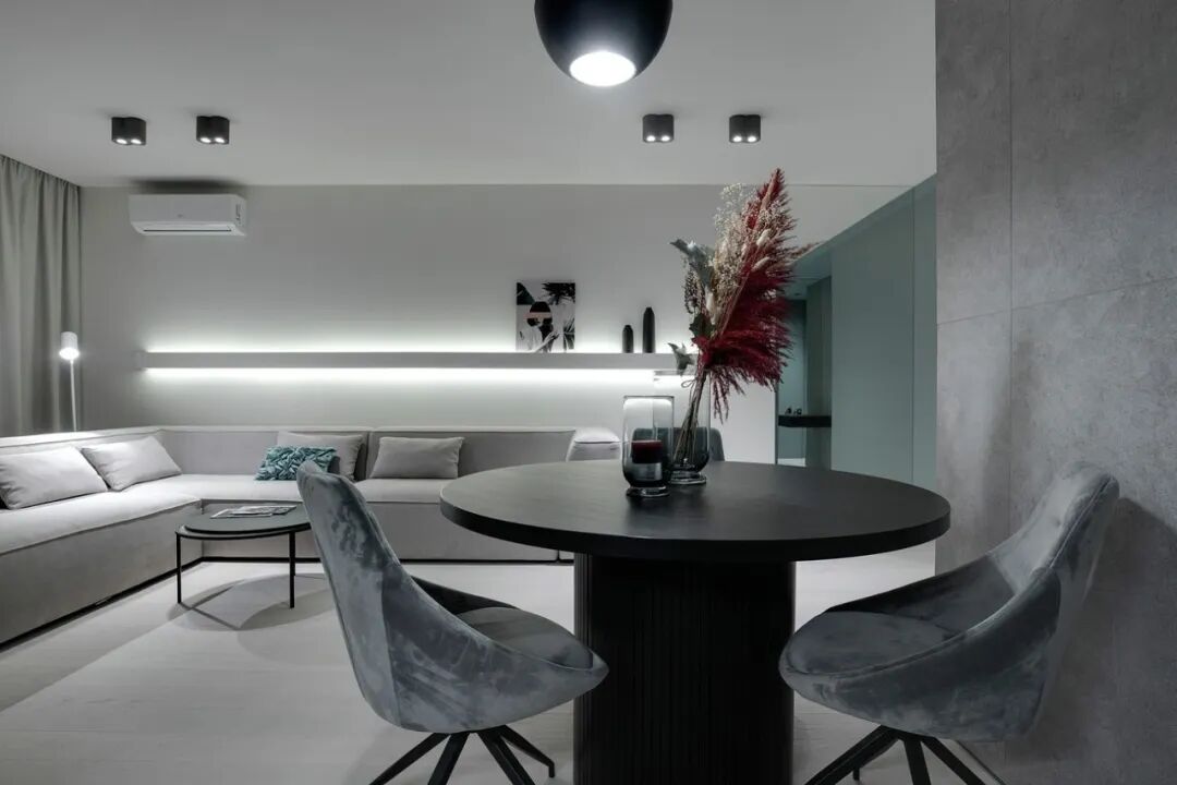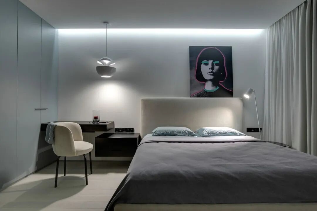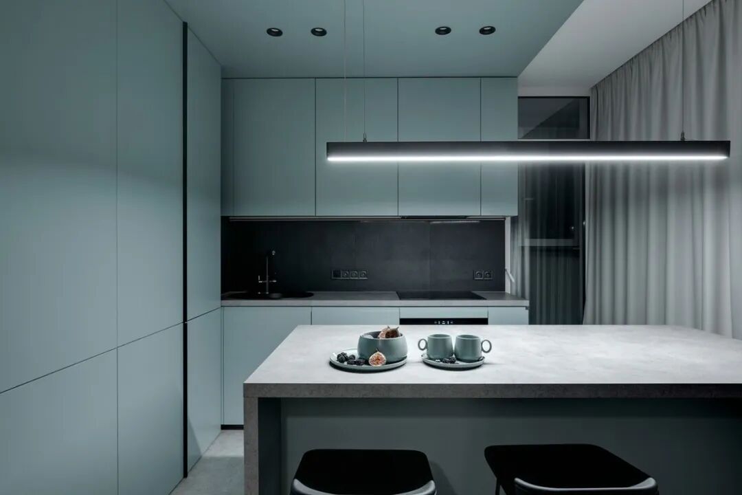 这套一室小住宅由设计师Yana Osipenko和Anastasiya Kurbakova共同设计,米色家居柔软自然,看起来非常舒适,光滑的表面,中性色调,轻木,柔软的纺织品和光。开放式的厨房,与起居空间一体,湿润的木饰面搭配深色的大理石,自然色调的柔和感加上些许装饰,就营造出了温馨氛围,小户型大理石+木饰面,一样可以秒杀大豪宅!大大的落地窗使得客厅光线充足,没有设主灯,顶部的灯带加上款式简约的壁灯,浅灰色沙发搭配木色地板,这是改善整个空间色温的好方法,使室内更加舒适和温暖。滑动木门后是卧室,简单的色彩,没有过多的修饰的线条,有一种恒久的灵思不轻易流走,有一种内敛的华彩不轻易张扬,给人视觉上的享受,每个角度都修饰的很完美,用平静的心灵看世界,利用淡淡的家具布局把原有的空间净化。卫生间以木色和蓝色的搭配,让空间色调不单一,有一种跳脱的美感,顿时喜欢的不得了,不同色彩,丰富空间的视觉效果。