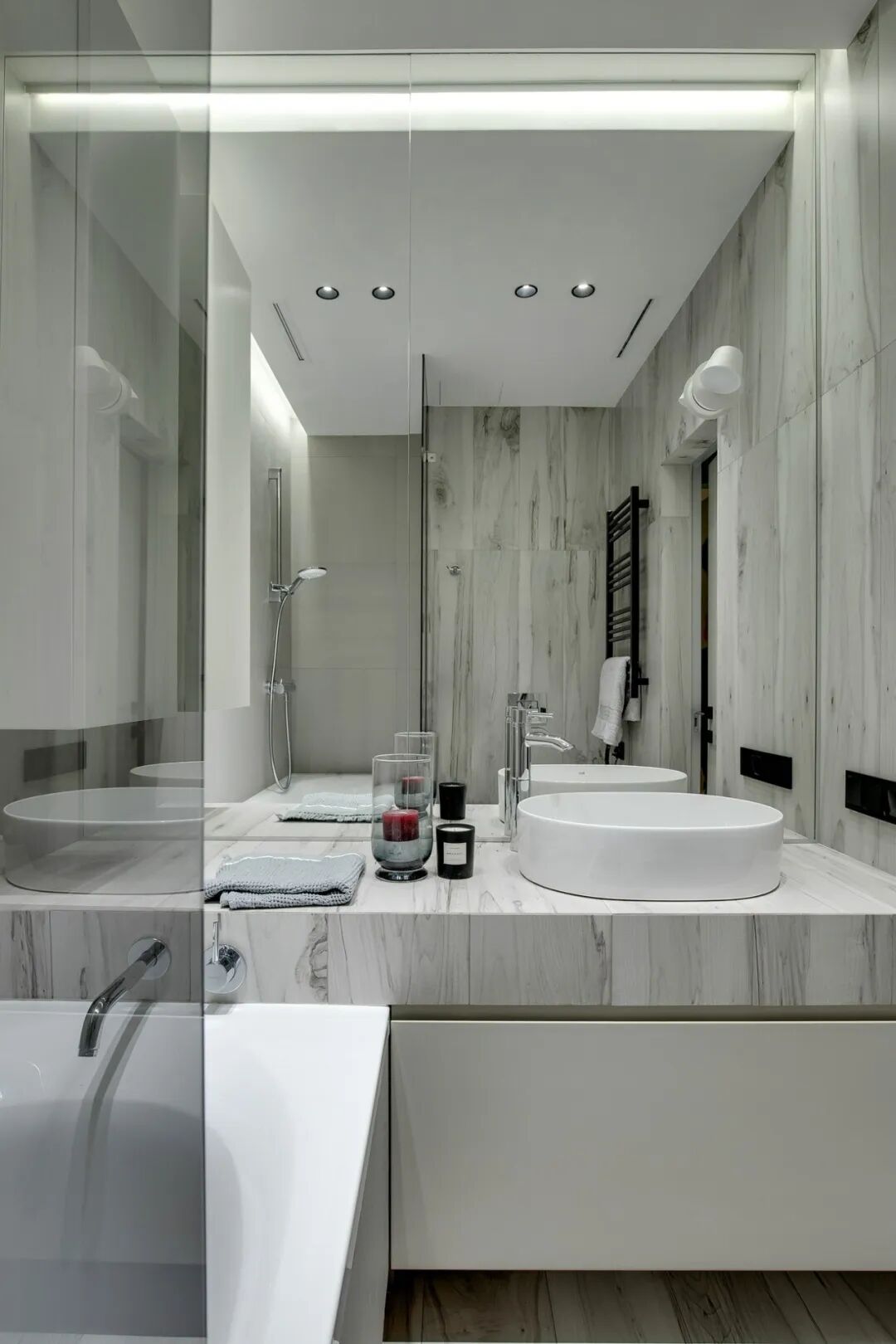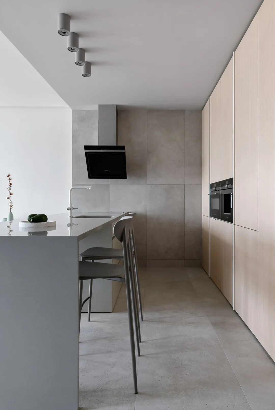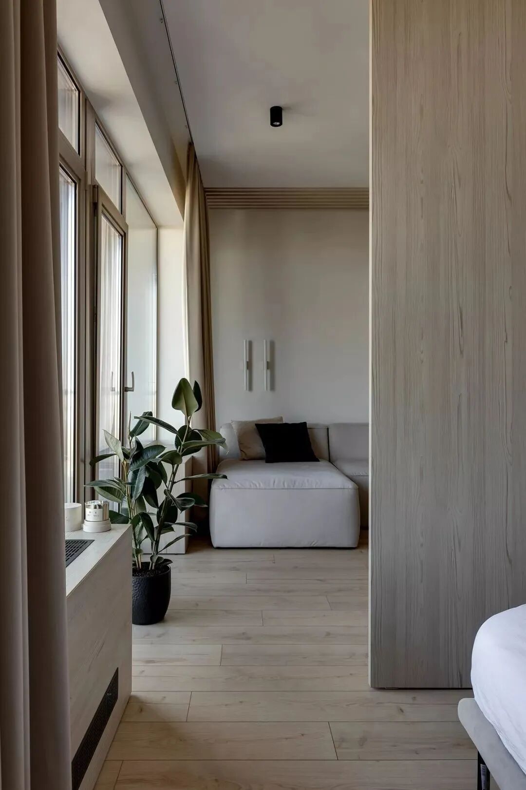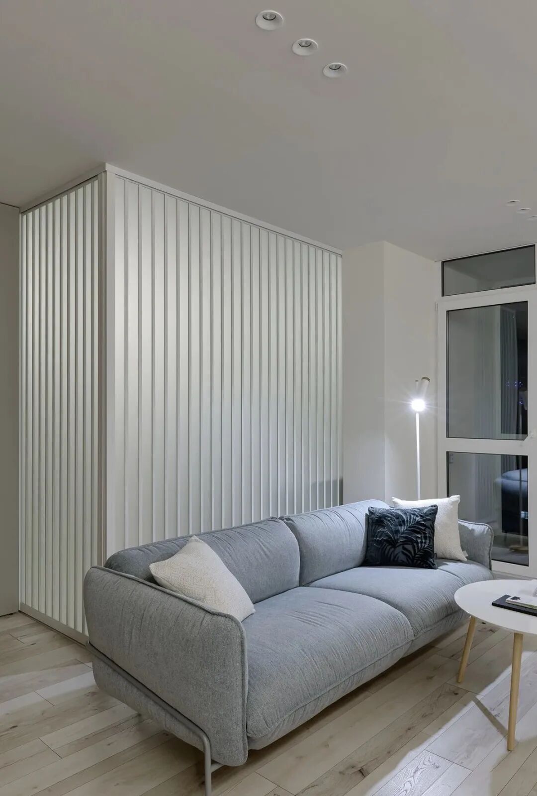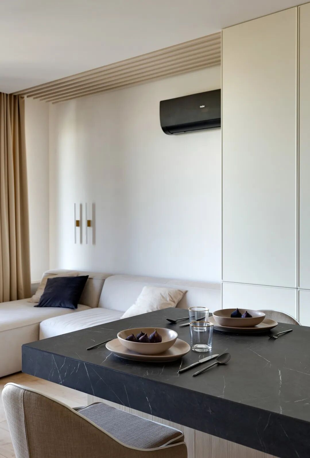 这套一室小住宅由设计师Yana Osipenko和Anastasiya Kurbakova共同设计,米色家居柔软自然,看起来非常舒适,光滑的表面,中性色调,轻木,柔软的纺织品和光。开放式的厨房,与起居空间一体,湿润的木饰面搭配深色的大理石,自然色调的柔和感加上些许装饰,就营造出了温馨氛围,小户型大理石+木饰面,一样可以秒杀大豪宅!大大的落地窗使得客厅光线充足,没有设主灯,顶部的灯带加上款式简约的壁灯,浅灰色沙发搭配木色地板,这是改善整个空间色温的好方法,使室内更加舒适和温暖。滑动木门后是卧室,简单的色彩,没有过多的修饰的线条,有一种恒久的灵思不轻易流走,有一种内敛的华彩不轻易张扬,给人视觉上的享受,每个角度都修饰的很完美,用平静的心灵看世界,利用淡淡的家具布局把原有的空间净化。卫生间以木色和蓝色的搭配,让空间色调不单一,有一种跳脱的美感,顿时喜欢的不得了,不同色彩,丰富空间的视觉效果。