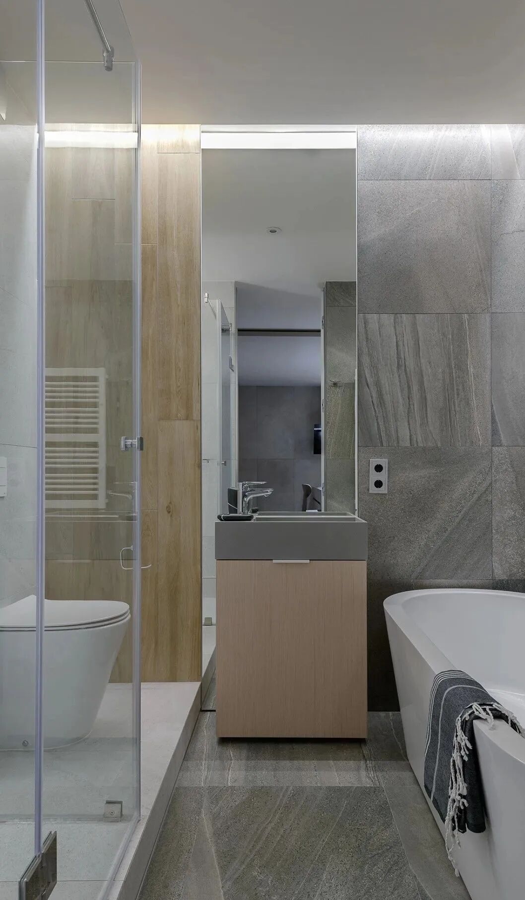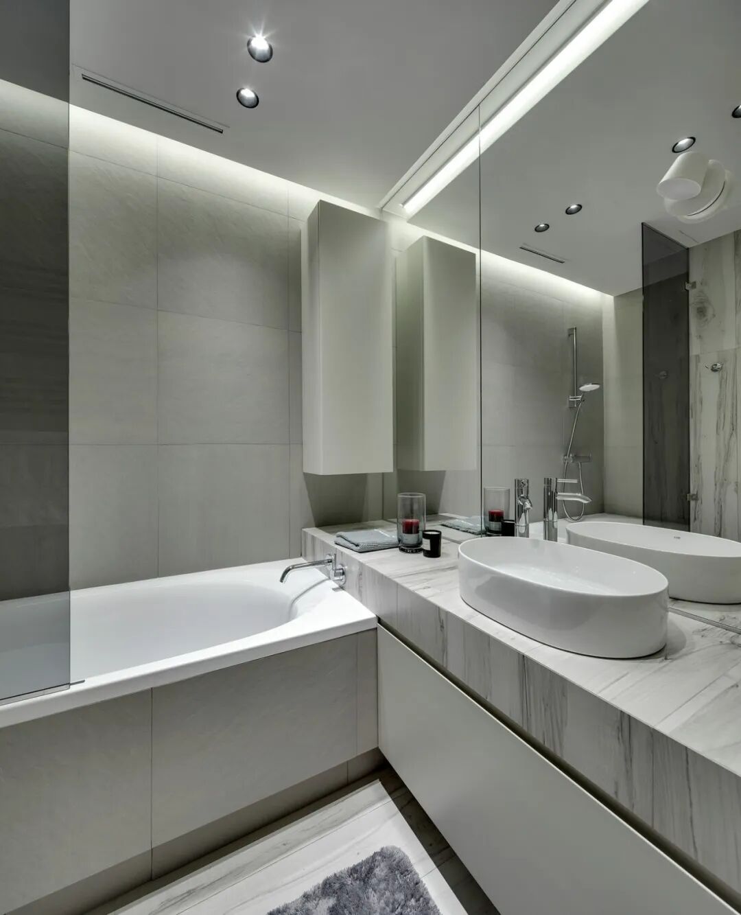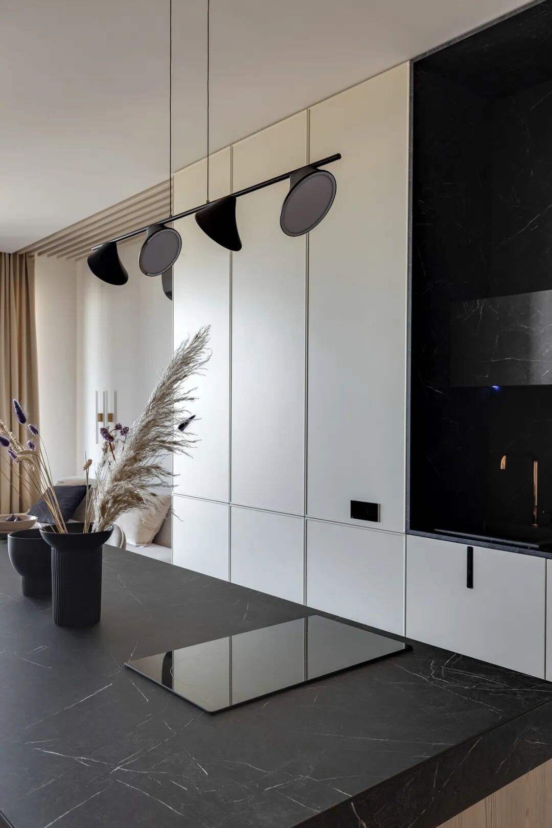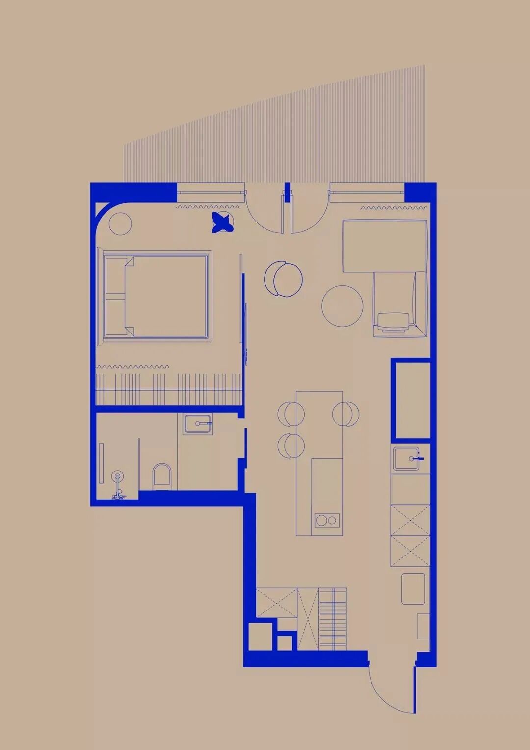 这套一室小住宅由设计师Yana Osipenko和Anastasiya Kurbakova共同设计,米色家居柔软自然,看起来非常舒适,光滑的表面,中性色调,轻木,柔软的纺织品和光。开放式的厨房,与起居空间一体,湿润的木饰面搭配深色的大理石,自然色调的柔和感加上些许装饰,就营造出了温馨氛围,小户型大理石+木饰面,一样可以秒杀大豪宅!大大的落地窗使得客厅光线充足,没有设主灯,顶部的灯带加上款式简约的壁灯,浅灰色沙发搭配木色地板,这是改善整个空间色温的好方法,使室内更加舒适和温暖。滑动木门后是卧室,简单的色彩,没有过多的修饰的线条,有一种恒久的灵思不轻易流走,有一种内敛的华彩不轻易张扬,给人视觉上的享受,每个角度都修饰的很完美,用平静的心灵看世界,利用淡淡的家具布局把原有的空间净化。卫生间以木色和蓝色的搭配,让空间色调不单一,有一种跳脱的美感,顿时喜欢的不得了,不同色彩,丰富空间的视觉效果。
