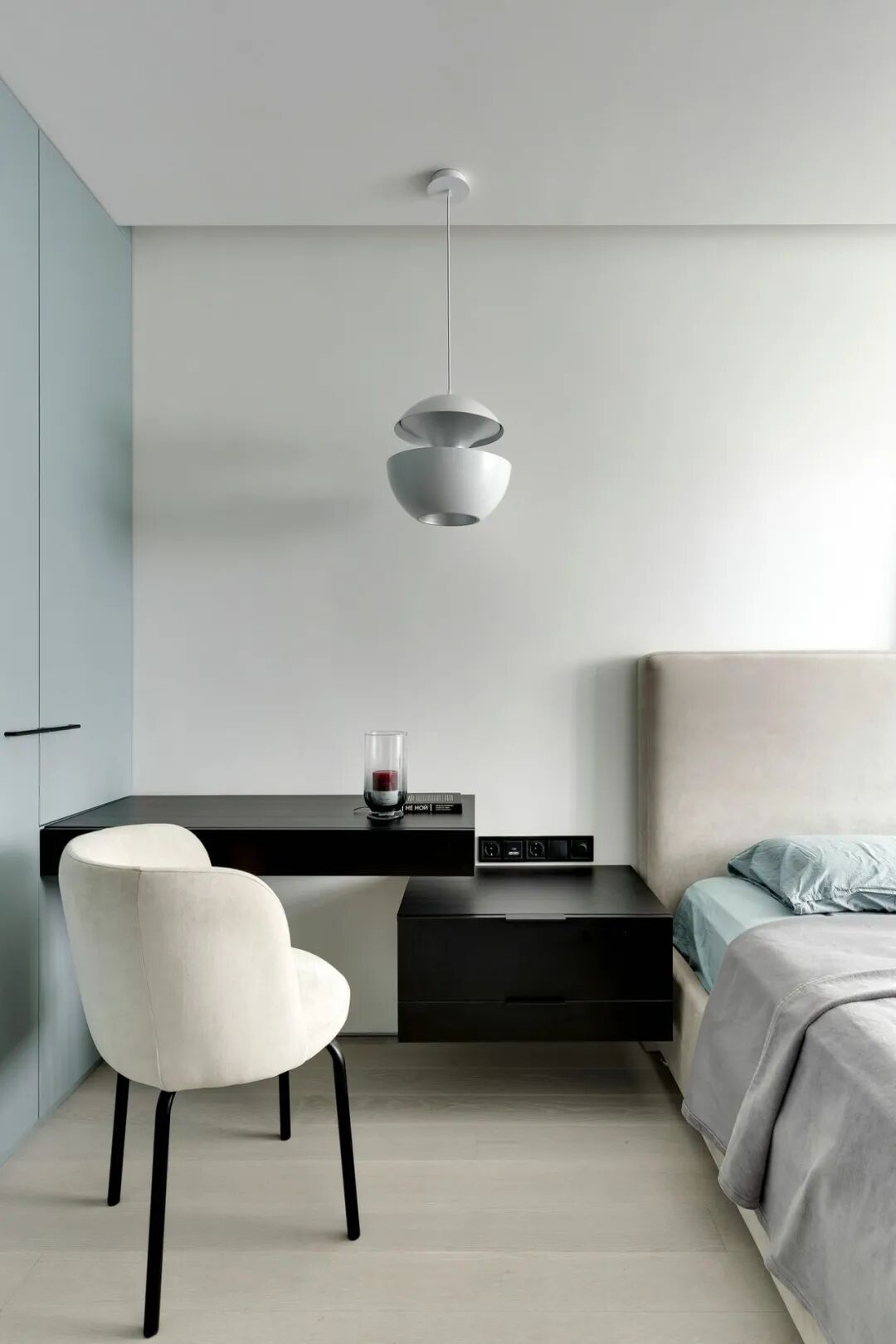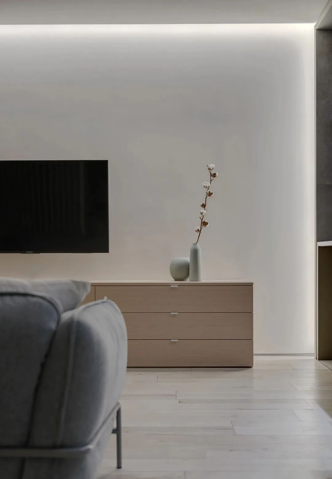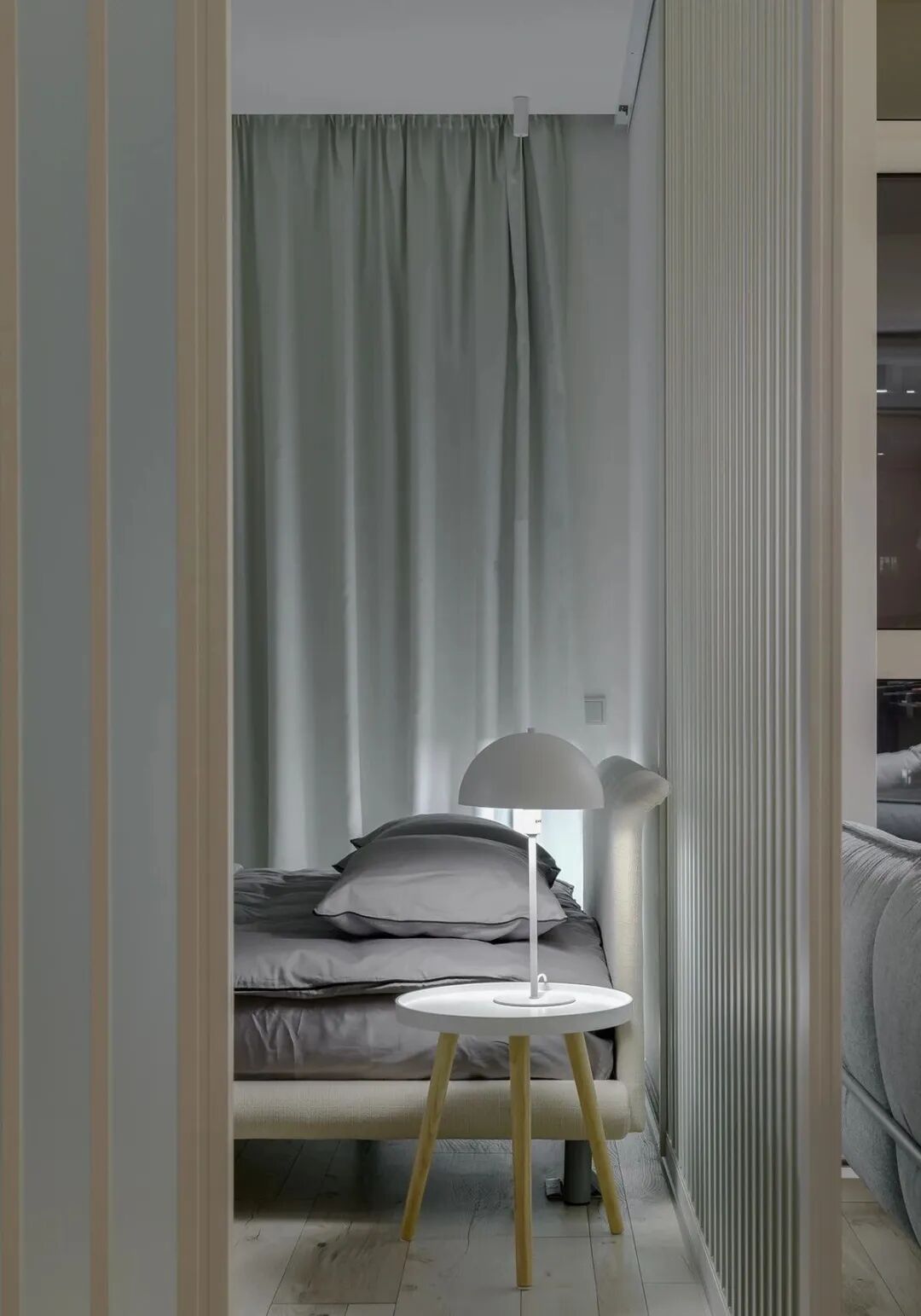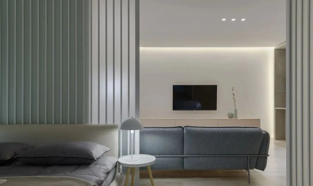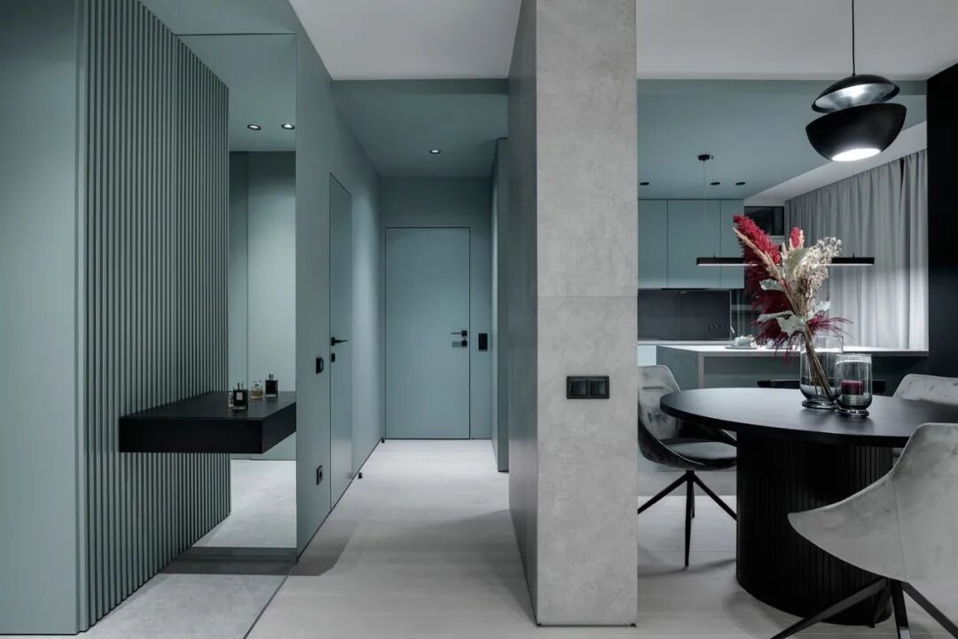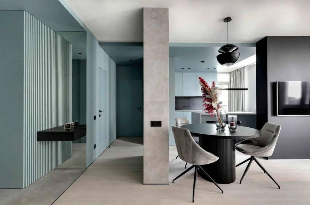 浅灰色和灰绿色的搭配创造了一个特殊的舒适的气氛,一个如此舒适的地方,设计师在室内使用了大量的浅色调与木元素、针织品,为屋主打造一个轻盈、温暖的雾棉公寓。