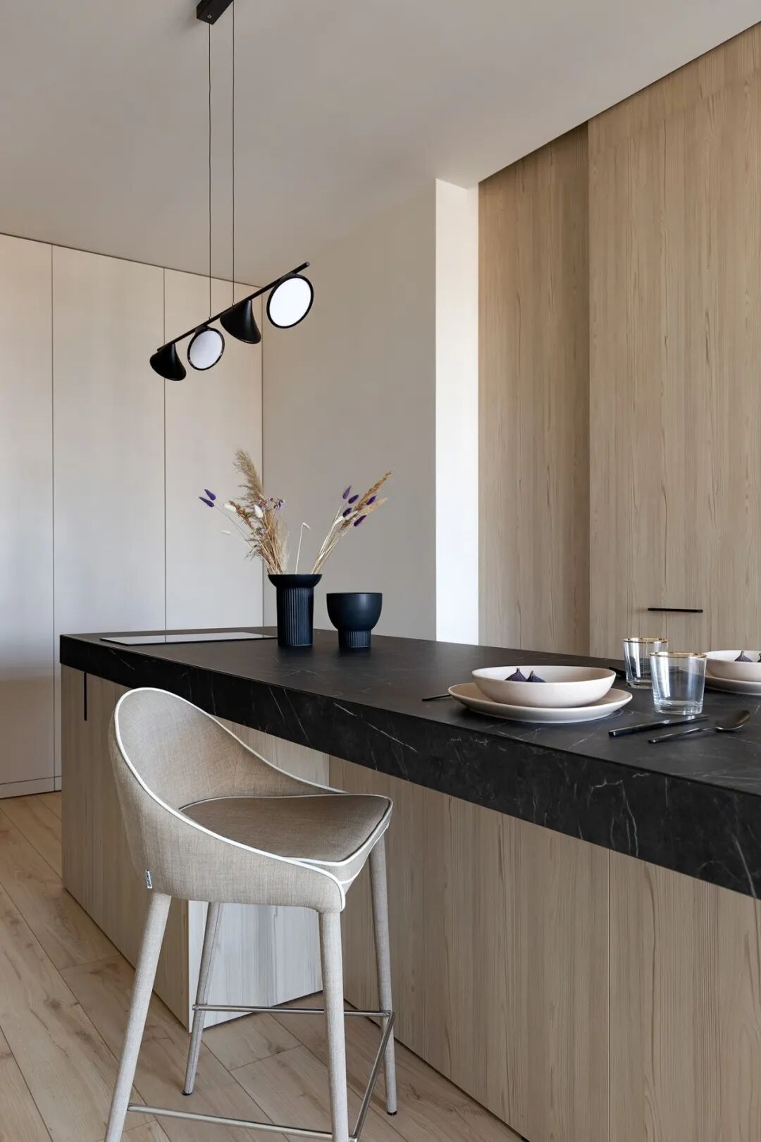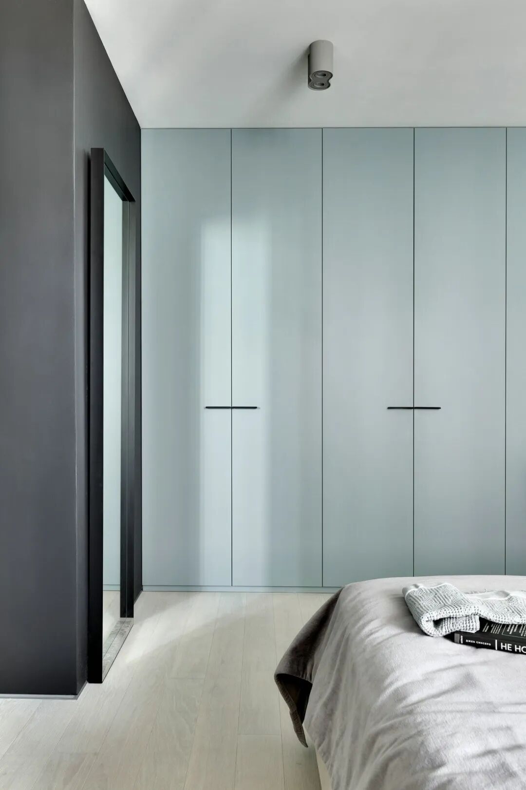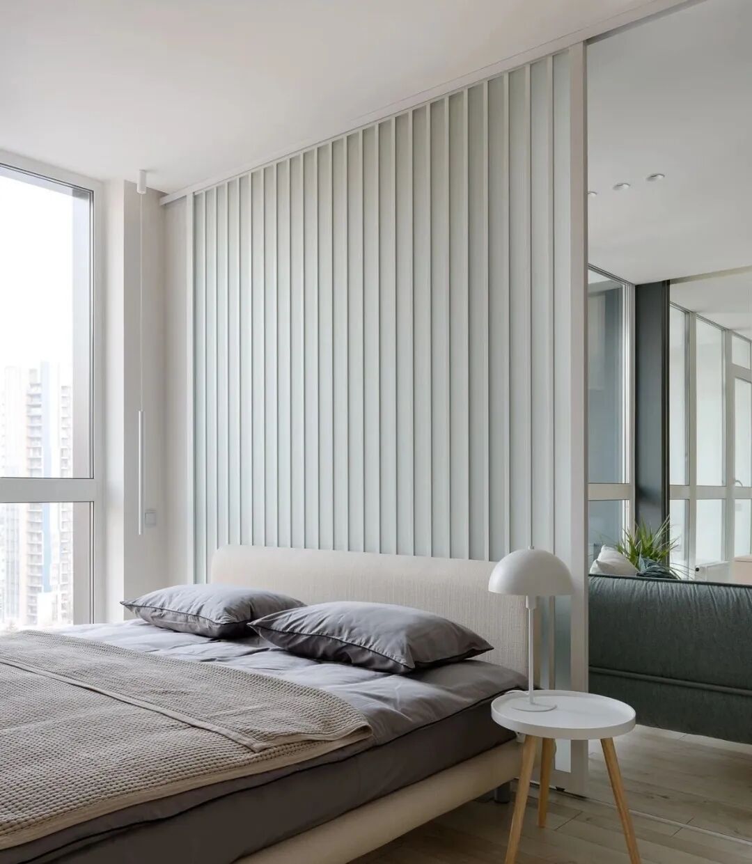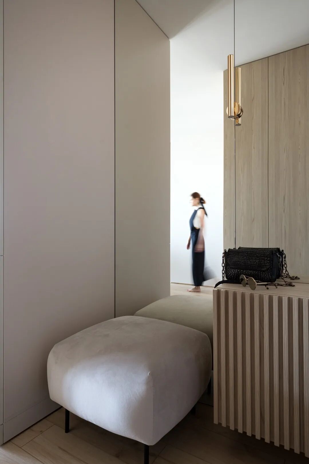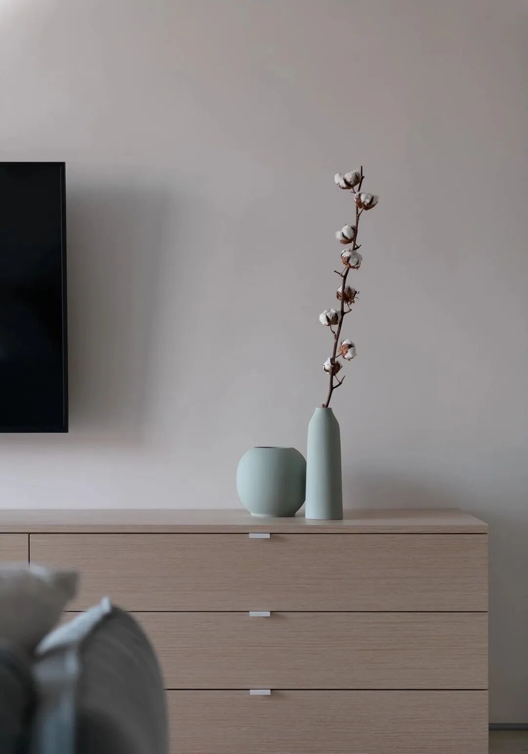浅灰色和灰绿色的搭配创造了一个特殊的舒适的气氛,一个如此舒适的地方,设计师在室内使用了大量的浅色调与木元素、针织品,为屋主打造一个轻盈、温暖的雾棉公寓。