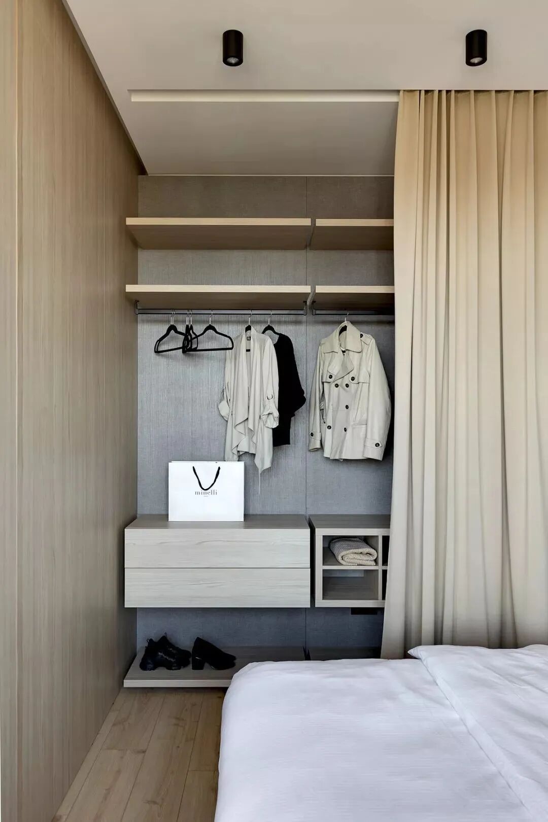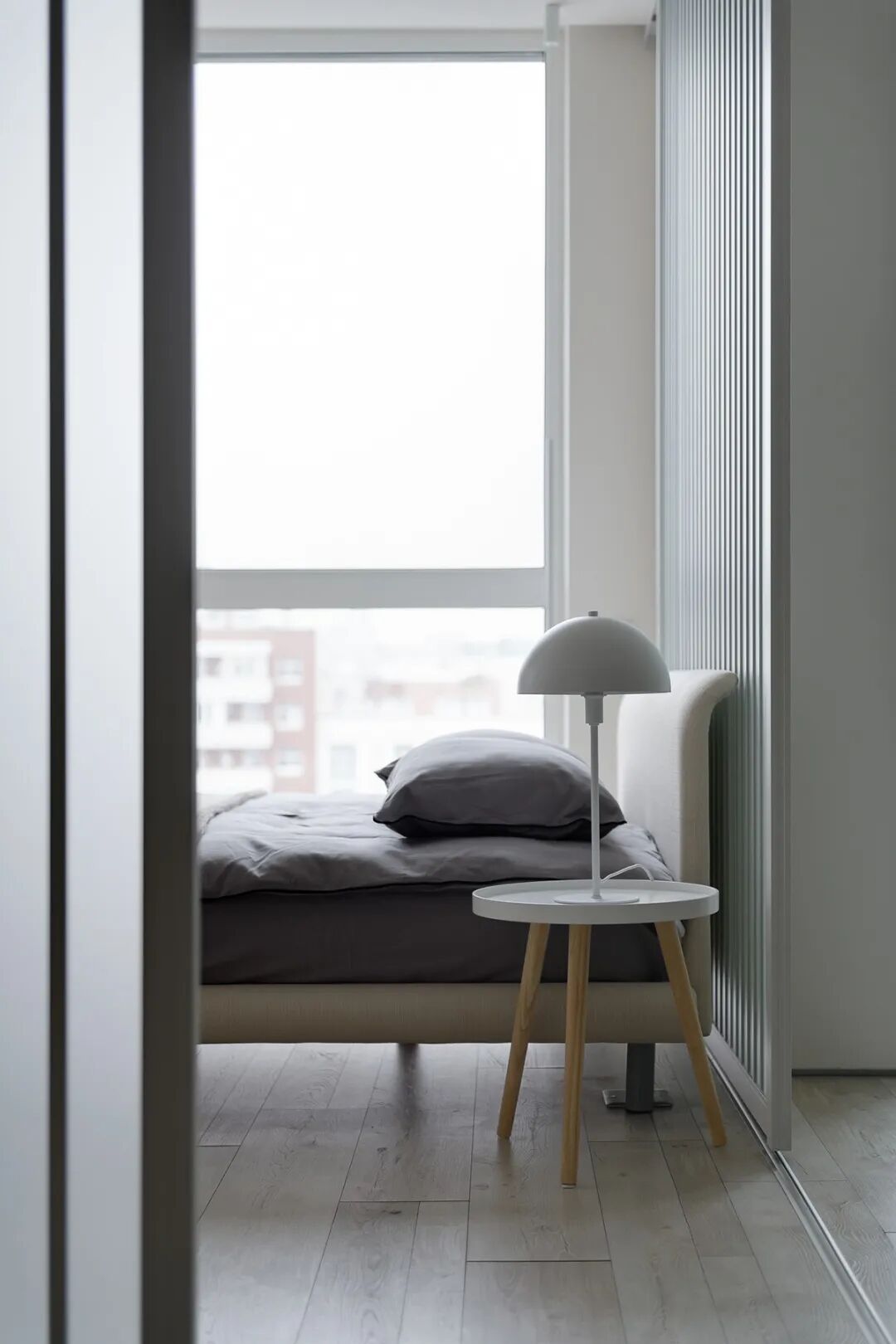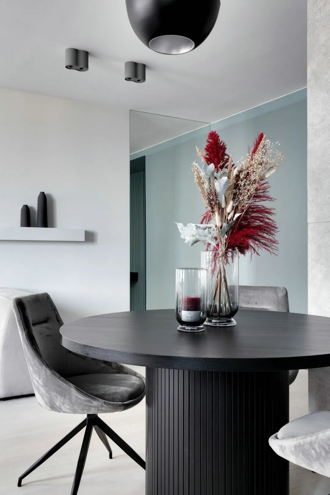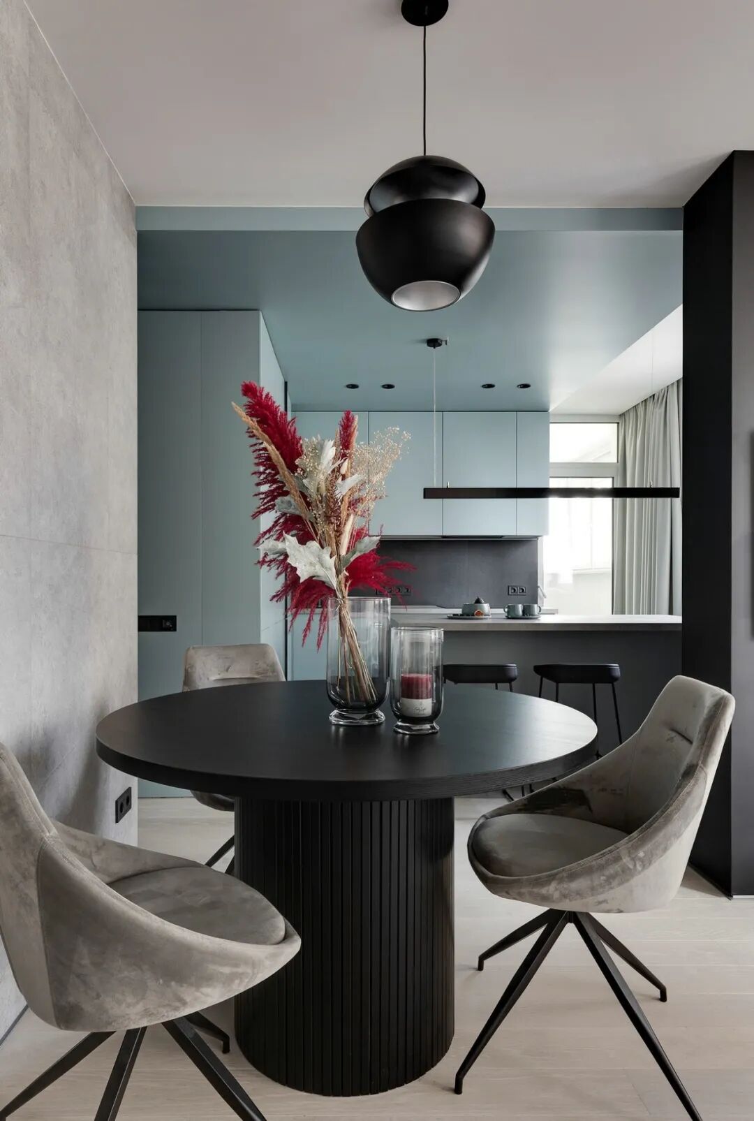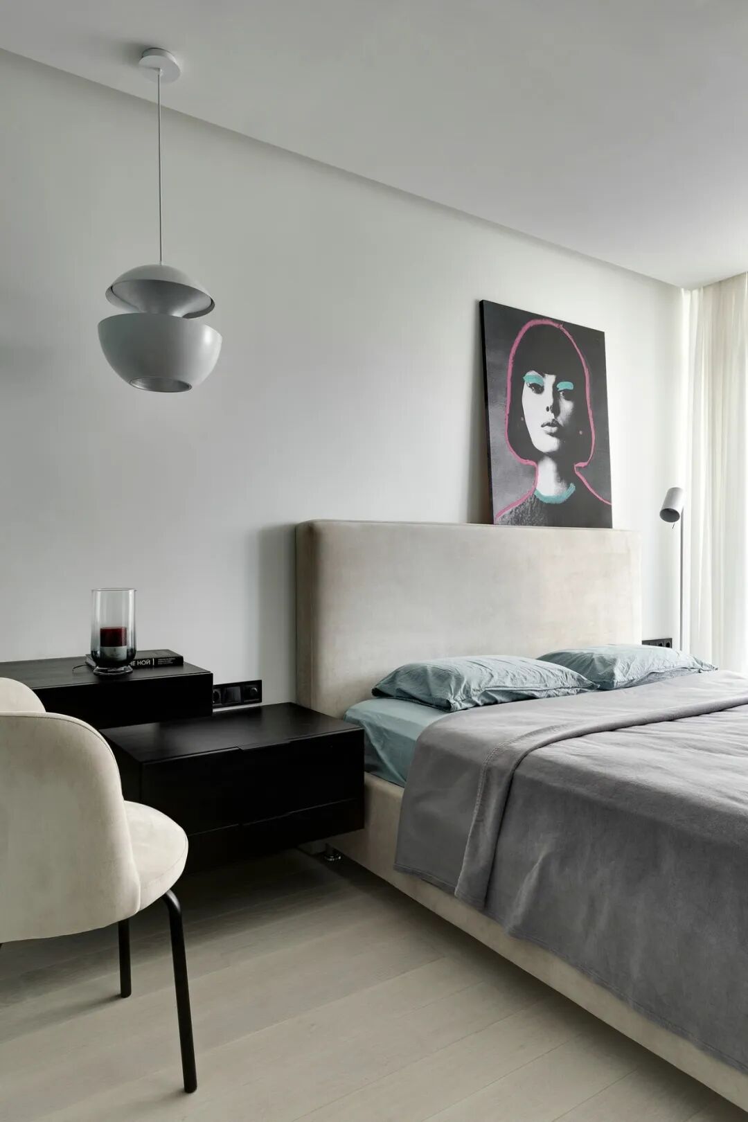 浅灰色和灰绿色的搭配创造了一个特殊的舒适的气氛,一个如此舒适的地方,设计师在室内使用了大量的浅色调与木元素、针织品,为屋主打造一个轻盈、温暖的雾棉公寓。