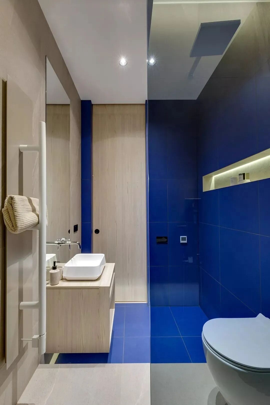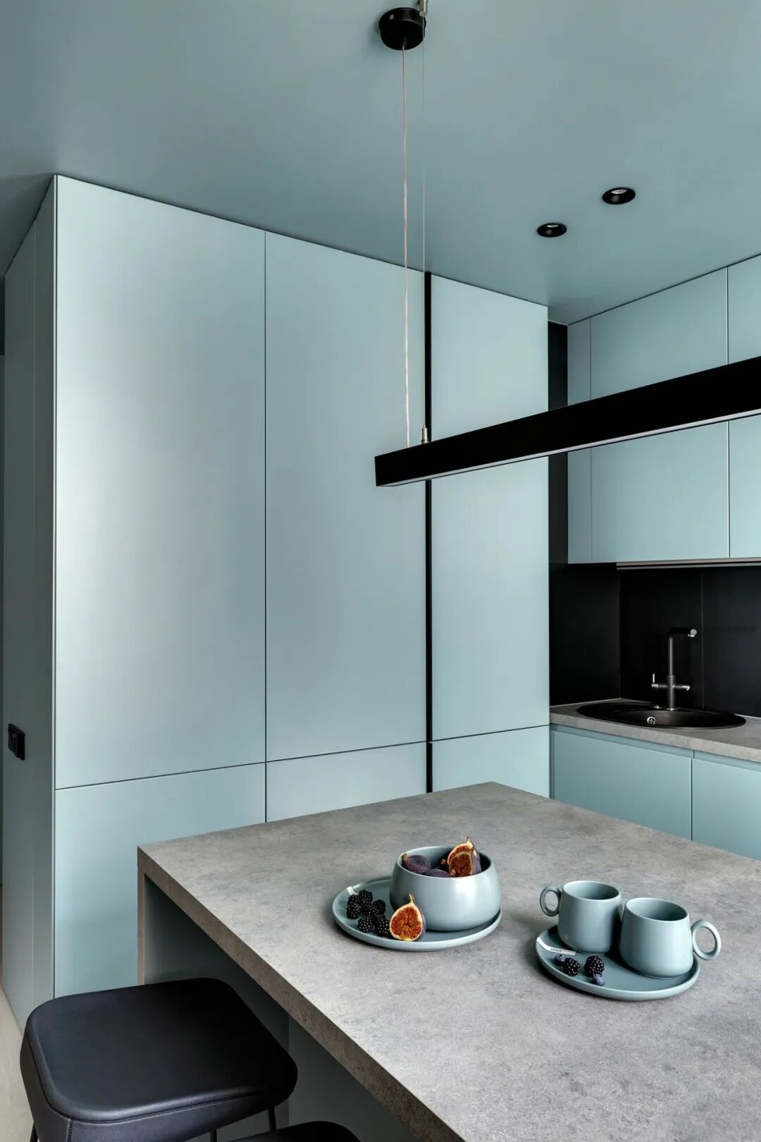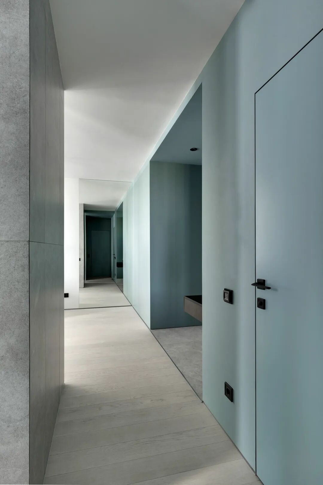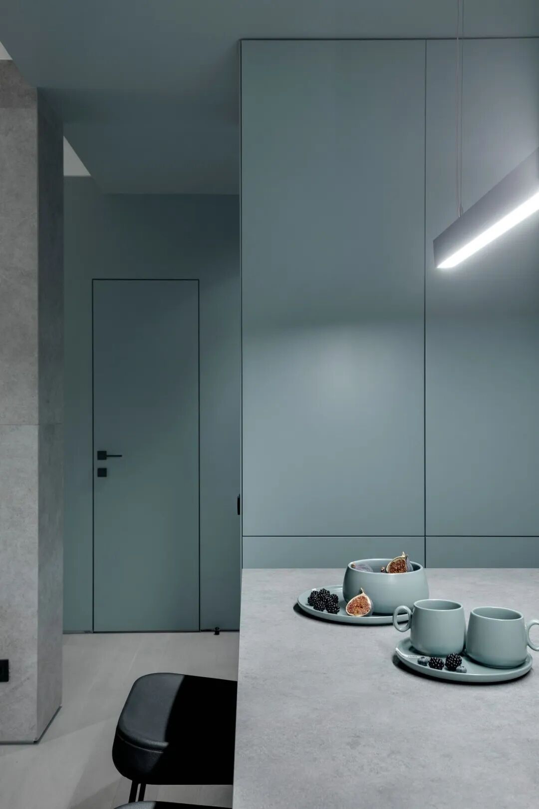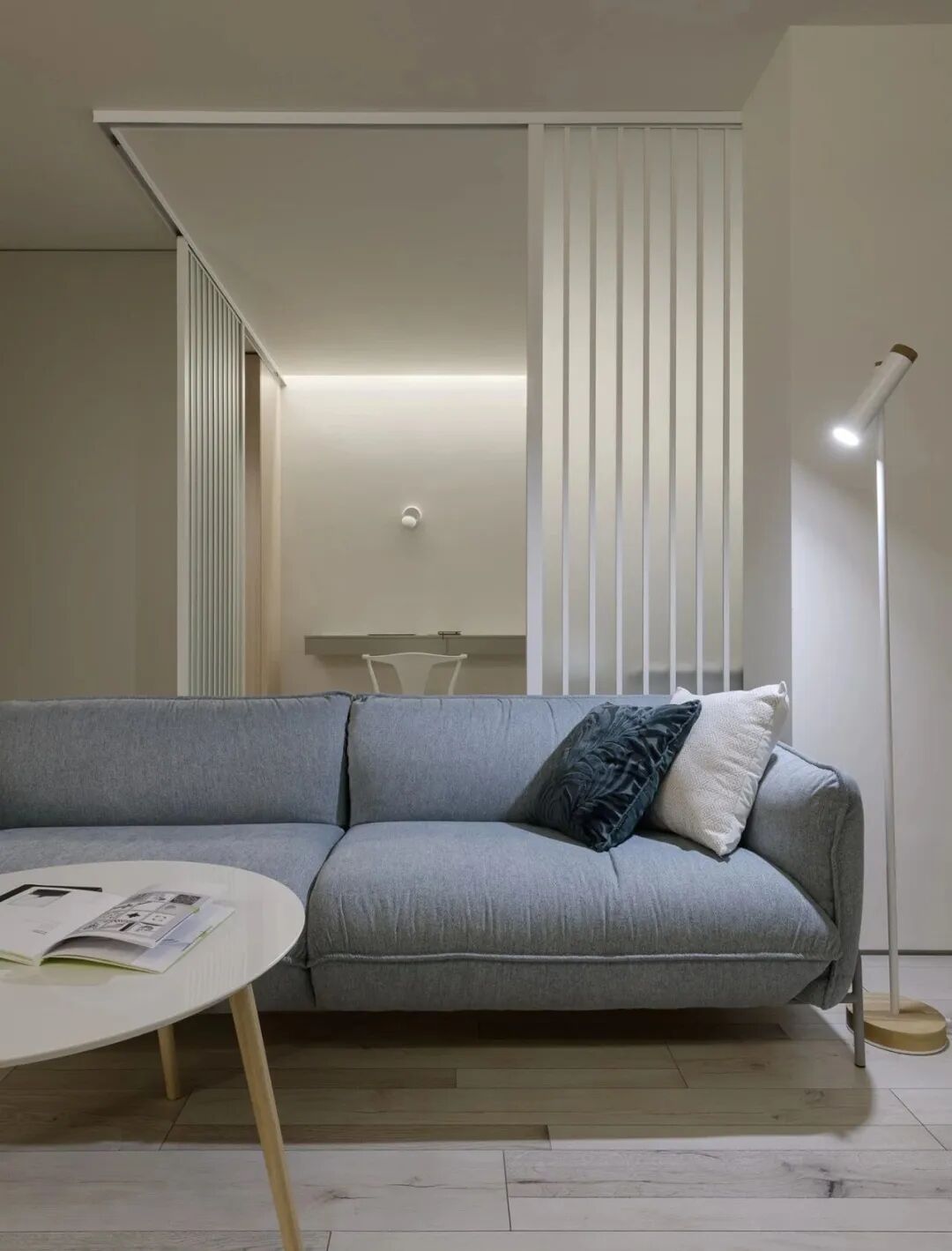 乙醚蓝,这是一种特殊颜色变成一个舒适的生活空间,在公寓创造了一种柔软,凉爽,包围的照明白天和晚上的感觉。