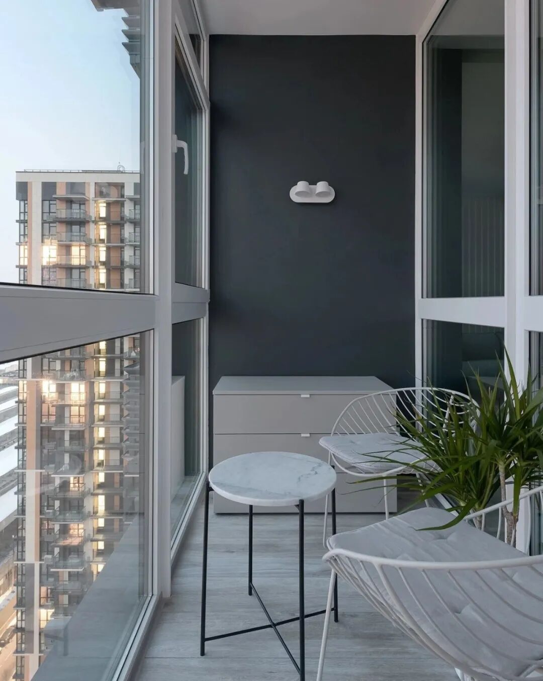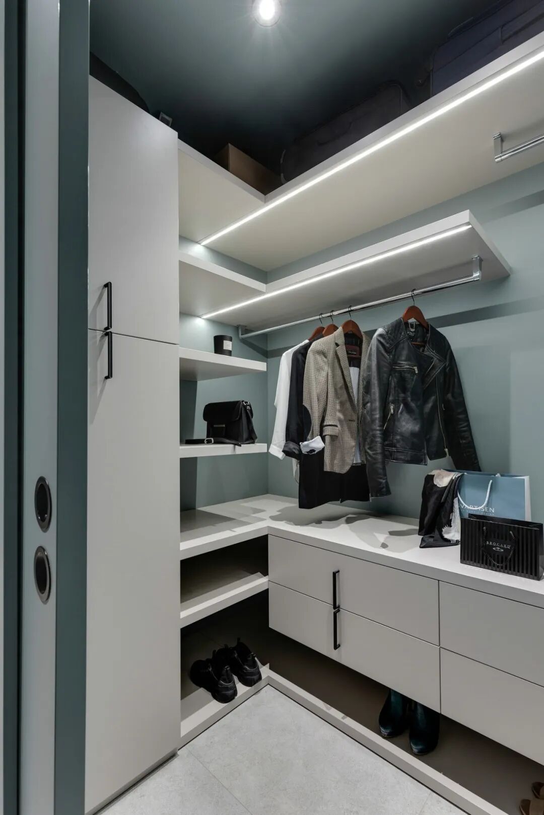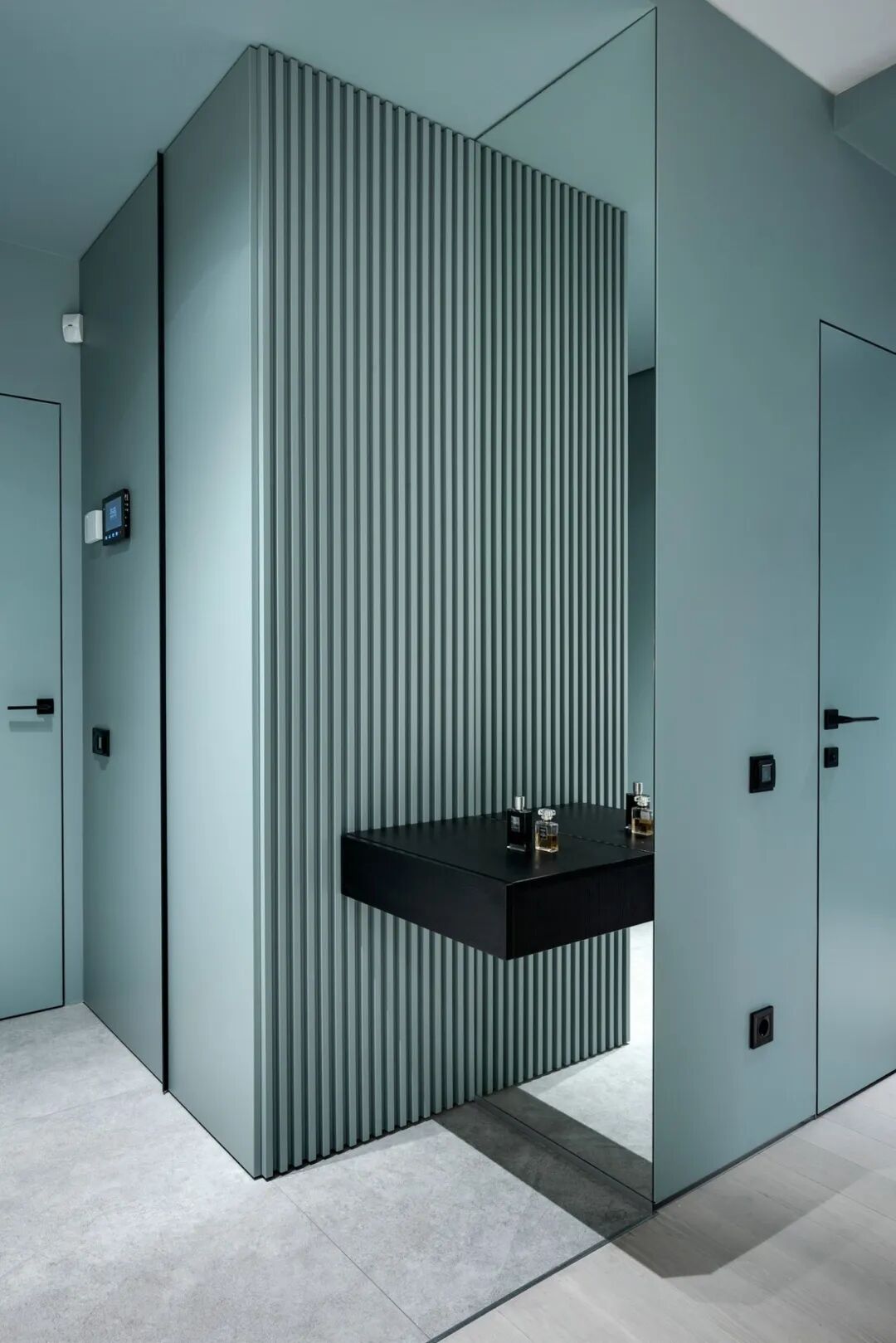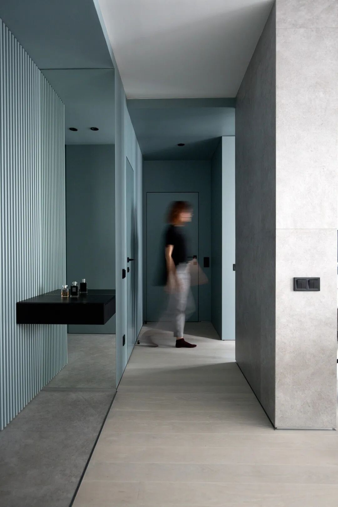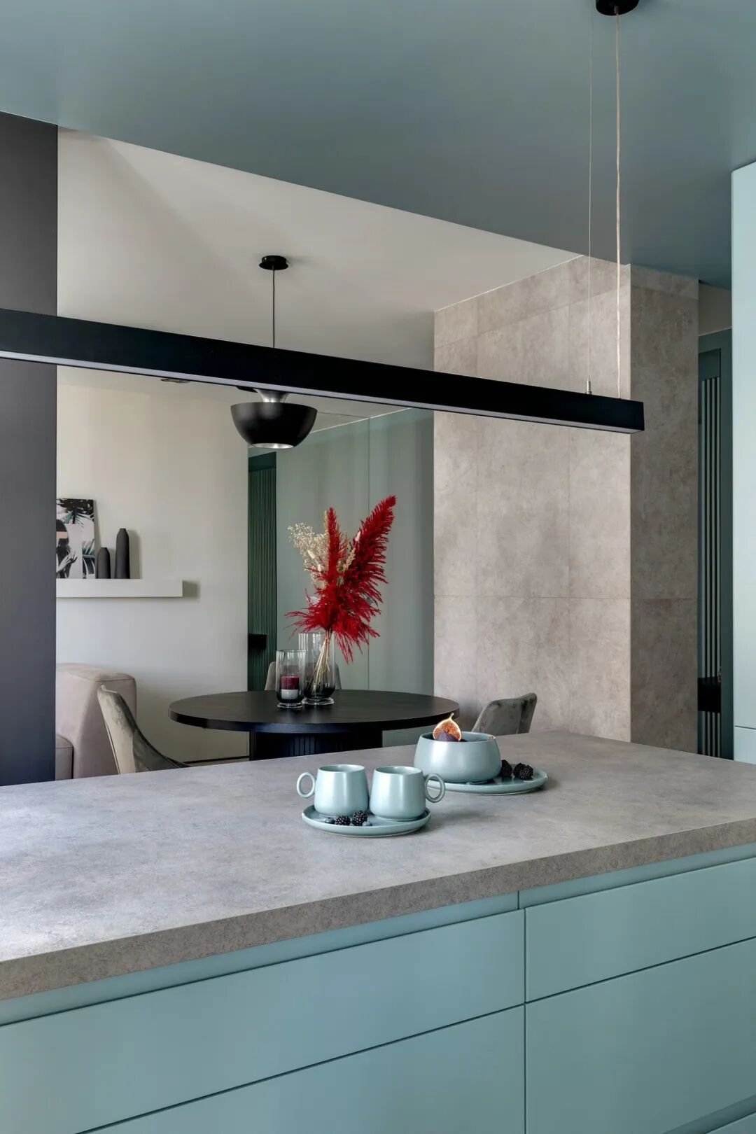 乙醚蓝,这是一种特殊颜色变成一个舒适的生活空间,在公寓创造了一种柔软,凉爽,包围的照明白天和晚上的感觉。