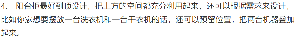 2、 阳台柜上面要提前规划好插座的位置,建议预留多几个插座位,方便后期电器使用,比如如果你想在阳台高柜里面摆放吸尘器的话,最好预留一个插座充电。