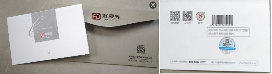 业主在收到好境界产品后,在安装前首先要求安装师傅找出配件箱,拿出此信封,如无信封或信封内无条形码和防伪码可以判定为假货。